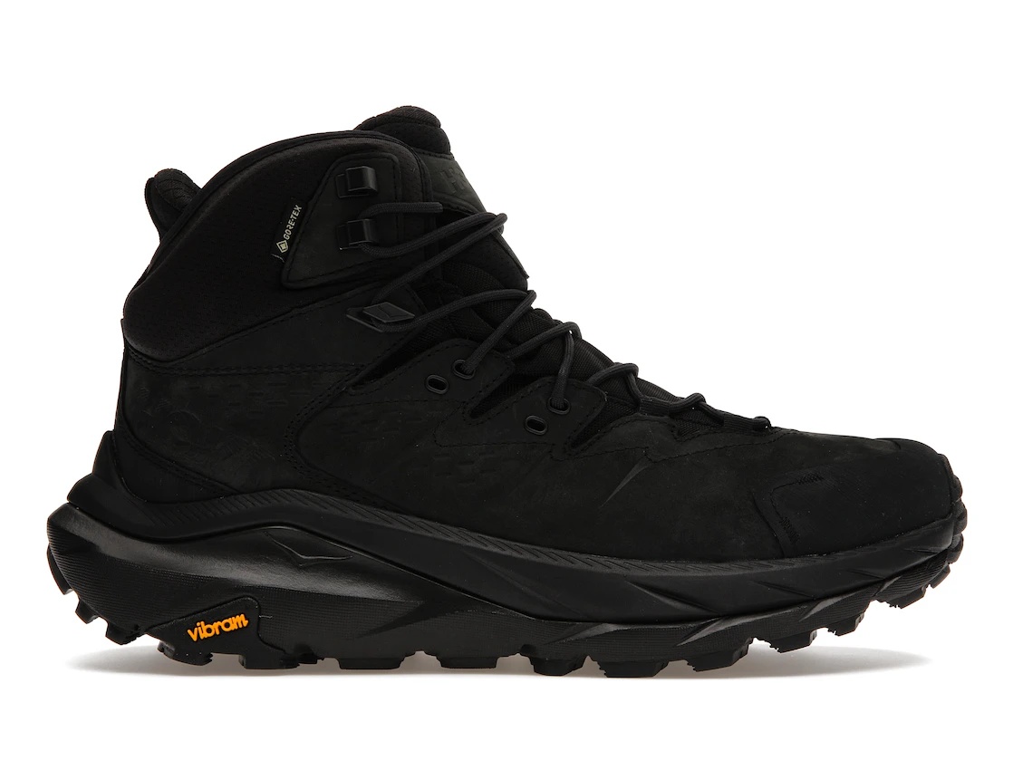 The Hoka One One Kaha 2 High Gore-Tex Black is a high-top shoe that is waterproof and windproof for durability. This iteration of the Hoka One One Kaha 2 High Gore-Tex has an upper made of black nubuck leather with a Gore-Tex membrane to ensure waterproofing and comfort. The shoe’s overlays run down from the eyestays in a square pattern in black, giving it an intense look. The heel features a Hoka logo in gray, while Gore-Tex branding appears on the top lateral eyestay. The shoe has a black rubber midsole with subtle gray branding on the inner side and a black outsole with bright yellow Vibram branding. What we love best about this sneaker is that it is durable enough for all weather conditions, making it the perfect hiking shoe. The Hoka One One Kaha 2 High Gore-Tex Black was released on October 25, 2022, for $240. - Style 1123155-BBLC / 1123155F-BBLC - Colorway Black/Black - Retail Price 240 - Release Date 2022-10-25 - Featured false