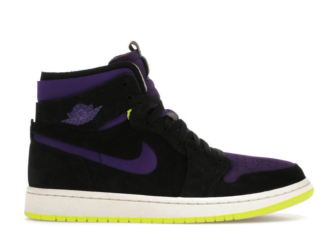 The Jordan 1 High Zoom Air CMFT Black Court Purple Lemon Venom (Women's) comes in women's sizes and has a black colorway with Court Purple and Lemon Venom accents. The upper of the Air Jordan 1 High Zoom Air CMFT in Black Court Purple Lemon Venom is constructed using a combination of premium black leather and soft suede overlays. Additionally, the sneaker for women features a padded ankle collar and a perforated toe-box for breathability, ensuring that the wearer's feet stay dry and comfortable inside the shoe. It has a high-top design which adds stability to the foot. The shoes come with black flat laces and the Air Jordan Wings logo is visible on the ankle. We believe that one of the standout features of this sneaker is the Zoom Air technology, which provides shock absorption and additional cushioning to the wearer's feet. The Jordan 1 High Zoom Air CMFT Black Court Purple Lemon Venom (Women's) was released on October 29th, 2020 at a retail price of $140. - Style CT0979-001 - Colorway Black/Court Purple-Lemon Venom-Sail - Retail Price 140 - Release Date 2020-10-29 - Featured false