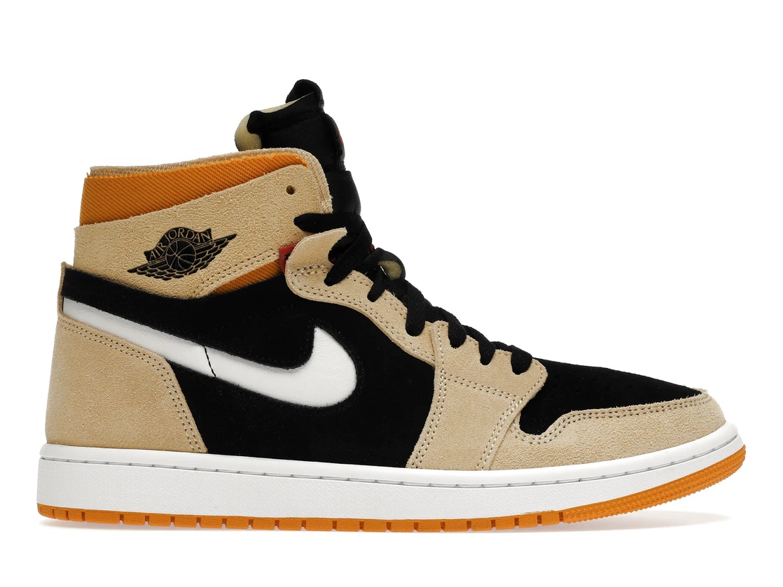 The Air Jordan 1 High Zoom Air CMFT Pumpkin Spice introduces autumnal colors in an updated version of the sneaker icon. The Air Jordan 1 High Zoom Air CMFT Pumpkin Spice is constructed on a Black suede base contrasted by a light shade of Orange suede overlays, with a darker shade of Orange introduced on the mesh collars and trim outsole. A cut-out Swoosh reveals a crisp white underlay, while a retro win(GS) for grade schoolers logo is stamped in black on the lateral collar flap. A Zoom Air unit delivers responsive cushioning underfoot. The Air Jordan 1 High Zoom Air CMFT Pumpkin Spice was released in January 2022 and retailed for $140. - Style CT0978-200 - Colorway Black/Orange/White - Retail Price 140 - Release Date 2022-01-05 - Featured false