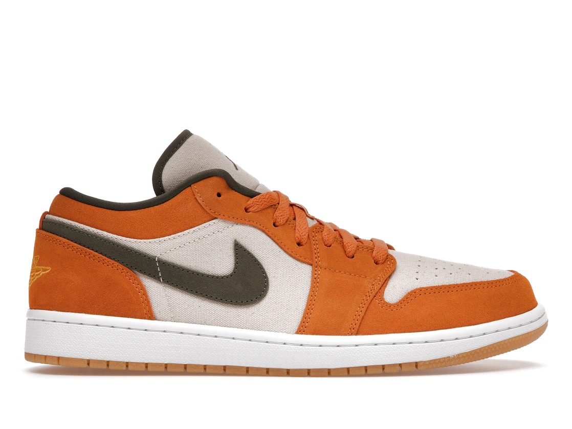The Air Jordan 1 Low Orange Olive is a low-cut version of the iconic Air Jordan 1. Slightly similar to the Nike Dunk Low Ceramic colorway revealed by Nike in 2020, this sneaker features a beige canvas upper contrasted by orange layers. Its upper is attached to a white midsole and a rubber outsole. To enhance its breathability, this shoe boasts a perforated toebox, while its outsole features designed patterns to enhance its grip. The Nike Air Jordan 1 Low Orange Olive was part of the Nike collection released in December 2021. Originally, this shoe had a retail price of $100. - Style DH6931-102 - Colorway Orange/Olive-Sail - Retail Price 100 - Release Date 2021-11-20 - Featured false
