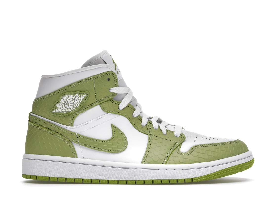 The Air Jordan 1 Mid Green Python (W) for women swaps outs its overlays for the titular material. The Air Jordan 1 Mid Green Python (W) features a two-tone colorway, white leather on the base, and a Green Python leather overlay featuring a faux-reptile print. The two-toned kicks are dominated by its titular shade, which features snake-like scales across the collars, forefoot and heel overlays, Swooshes, and backdrops of the ball-and-win(GS) for grade schoolers-logos. White appears on the toe boxes, quarters, tongues, and midsoles. More touches of Green Python make their way onto the Jumpman logos stamped on the tongues. The Air Jordan 1 Mid Green Python (W) was released in May 2022 and retailed for $135. - Style DV2959-113 - Colorway White/White/Vivid Green - Retail Price 135 - Release Date 2022-05-03 - Featured false