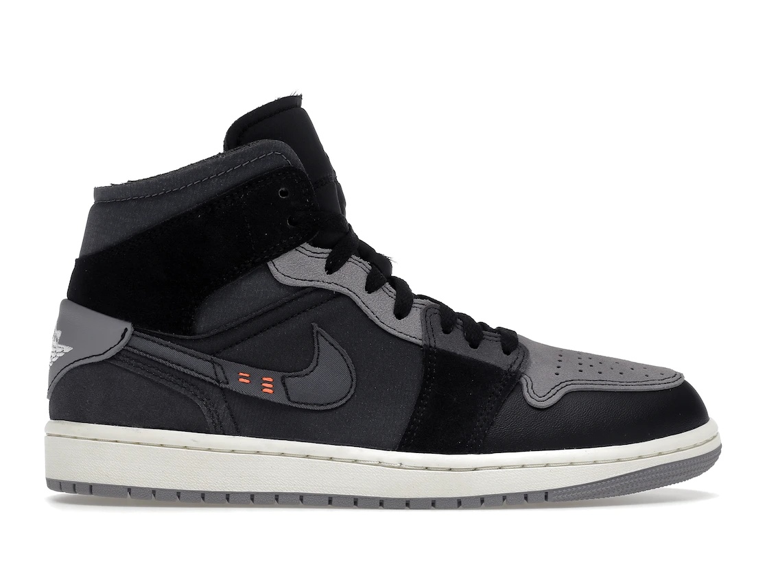 The Air Jordan 1 Mid Inside Out Black upper is constructed of suede material. The shoes feature visible tongues and foam collars. Additionally, it displays black and grey color schemes on under-side suede overlays and a toe box that rests on top of the toe cap. The heel is double-stacked to allow for both Low and Mid positions, and the pair comes with exposed liners, mixed-and-matched materials, and contrast stitching. Through #23 stitching on the Swoosh and the insoles, an additional dash of orange is imparted, contributing to the overall appearance of the sneaker. The Air Jordan 1 Mid Inside Out Black debuted on October 4th, 2022, and retailed at a price of $150. - Style DM9652-001 - Colorway Black/Grey-Orange - Retail Price 135 - Release Date 2022-10-04 - Featured false