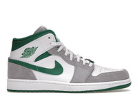 The Jordan 1 Mid Grey Green features a white leather upper with grey Durabuck overlays and metallic green Swooshes and collars. From there, a metallic green lace tag and signature Wings logo on the collar completes the design. The Jordan 1 Mid Grey Green released in November of 2021 and retailed for $120. - Style DC7294-103 - Colorway White/Neutral Grey-Lucky Green - Retail Price 120 - Release Date 2021-11-17 - Included Accessories Green jordan dubrae - Featured false