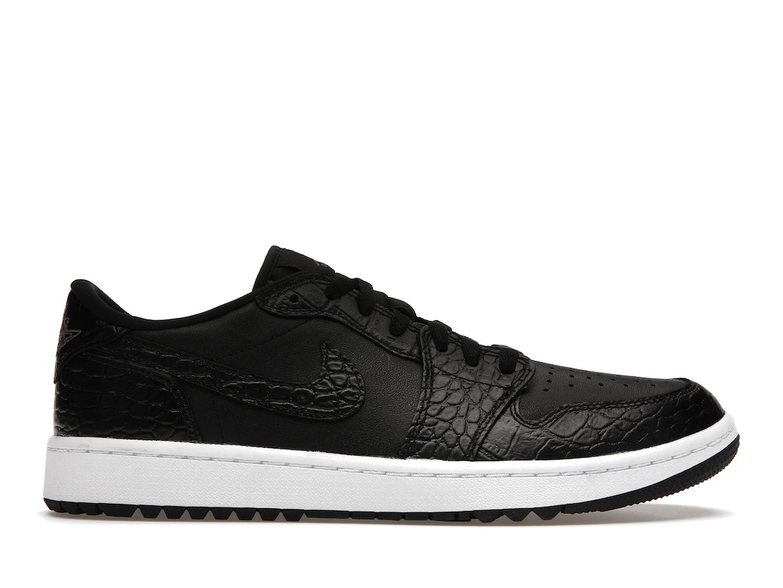 The Jordan 1 Retro Low Golf Black Croc was released in 2023 as part of the Jordan Brand's golf collection. The Black Jordan 1 Retro Low Golf Croc has a durable rubber outsole with a unique outsole pattern that maximizes traction and stability on the course. The shoe's midsole features Nike's proprietary Air technology, providing ample cushioning and support for the golfer's feet. The shoe is also equipped with a removable and interchangeable spikes system, which allows golfers to adjust their traction depending on course conditions. The spikes are made with durable TPU materials that provide ample grip on the course's grass or terrain, ensuring that golfers can take a precise swing without slipping or losing balance. What we like the most about the Jordan 1 Retro Low Golf Black Croc? It's without a doubt its premium black crocodile leather upper, which gives the shoe a bold, luxurious look. The leather is water-resistant and provides ample protection to the foot during damp weather conditions. The shoe was released on January 7th, 2023 at a retail price of $140. - Style DD9315-003 - Colorway Black/Black/Iron Grey/White - Retail Price 140 - Release Date 2023-01-07 - Featured false