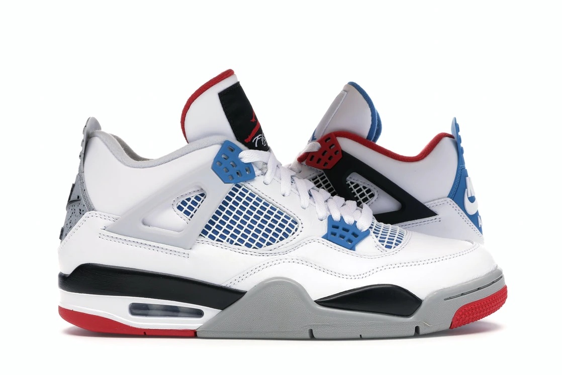 To celebrate the 30th Anniversary of the Air Jordan 4, Jordan Brand released the special-edition Jordan 4 Retro What The, now available on StockX. In traditional Nike fashion, this design is mash-up of the most notable Jordan 4 colorways to ever release. The colorways represented include White Cement, Military Blue, Fire Red, and Black Cement. This Jordan 4 features a white leather upper with fire red, black, and military blue detailing. A cement midsole, mismatched tongue and heel labels, and contrasting outsoles completes the design. These sneakers released in November of 2019 and retailed for $200. - Style CI1184-146 - Colorway White/Military Blue-Fire Red-Black-Cement Grey - Retail Price 200 - Release Date 2019-11-23 - Included Accessories Black Laces - Featured false - Styles Headwear