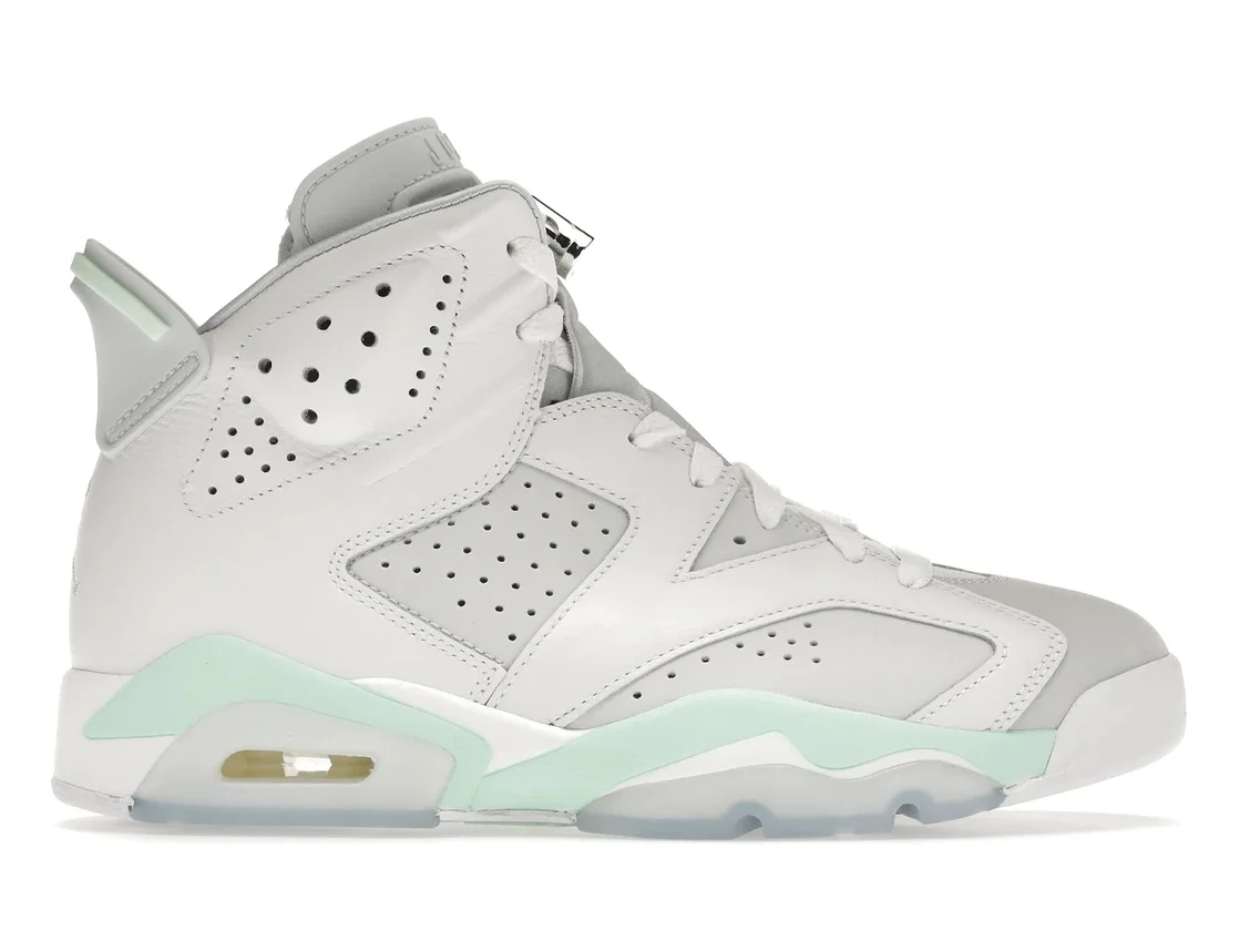 Jordan Brand kicked off Women's History Month 2022 with the women's exclusive Air Jordan 6 Mint Foam (W). With a tumbled white leather and soft grey Durabuck two-tone construction, the upper of the women's Air Jordan 6 Mint Foam (W) takes inspiration from the classic Air Jordan 6 Carmine's color blocking. Vibrant hits of that Mint Foam color on midsole and heel tab bring a contrast to the design's mostly neutral palette. An icy semi-translucent outsole adds a classic finishing touch. The women's Air Jordan 6 Mint Foam (W) released in March of 2022 and retailed for $200. - Style DQ4914-103 - Colorway White/Pure Platinum-Mint Foam - Retail Price 200 - Release Date 2022-03-08 - Included Accessories Lacelocks - Featured false