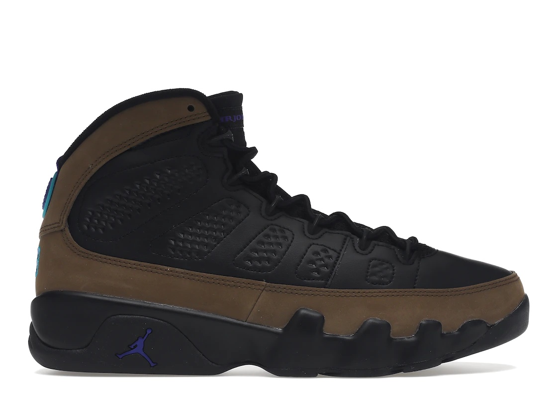 The Jordan 9 Retro Light Olive Concord is available in a black, Bright Concord, Light Olive, and Aquatone color scheme. The Light Olive Concord Jordan 9 Retro showcases an upper primarily crafted using a blend of leather, suede, and synthetic materials, ensuring both longevity and comfort. The iconic Jumpman logo is prominently featured on the midsole. It incorporates a lace-up closure system that guarantees a secure and tailored fit. The midsole is cushioned, delivering responsiveness and reinforcement. The outsole is constructed from robust rubber, providing reliable traction and stability. Additionally, the shoe highlights "JUMPMAN" lettering on the tongue and a "23" engraving on the heel. According to our experts, the notable feature of the Jordan 9 Retro Light Olive Concord is its impressive color scheme of black, Bright Concord, Light Olive, and Aquatone. The color combination gives the sneaker a more subtle and sophisticated aesthetic. The shoe was released on January 7th, 2023, and sold at a retail price of $200. - Style CT8019-034 - Colorway Black/Bright Concord/Light Olive/Aquatone - Retail Price 200 - Release Date 2023-01-07 - Featured false