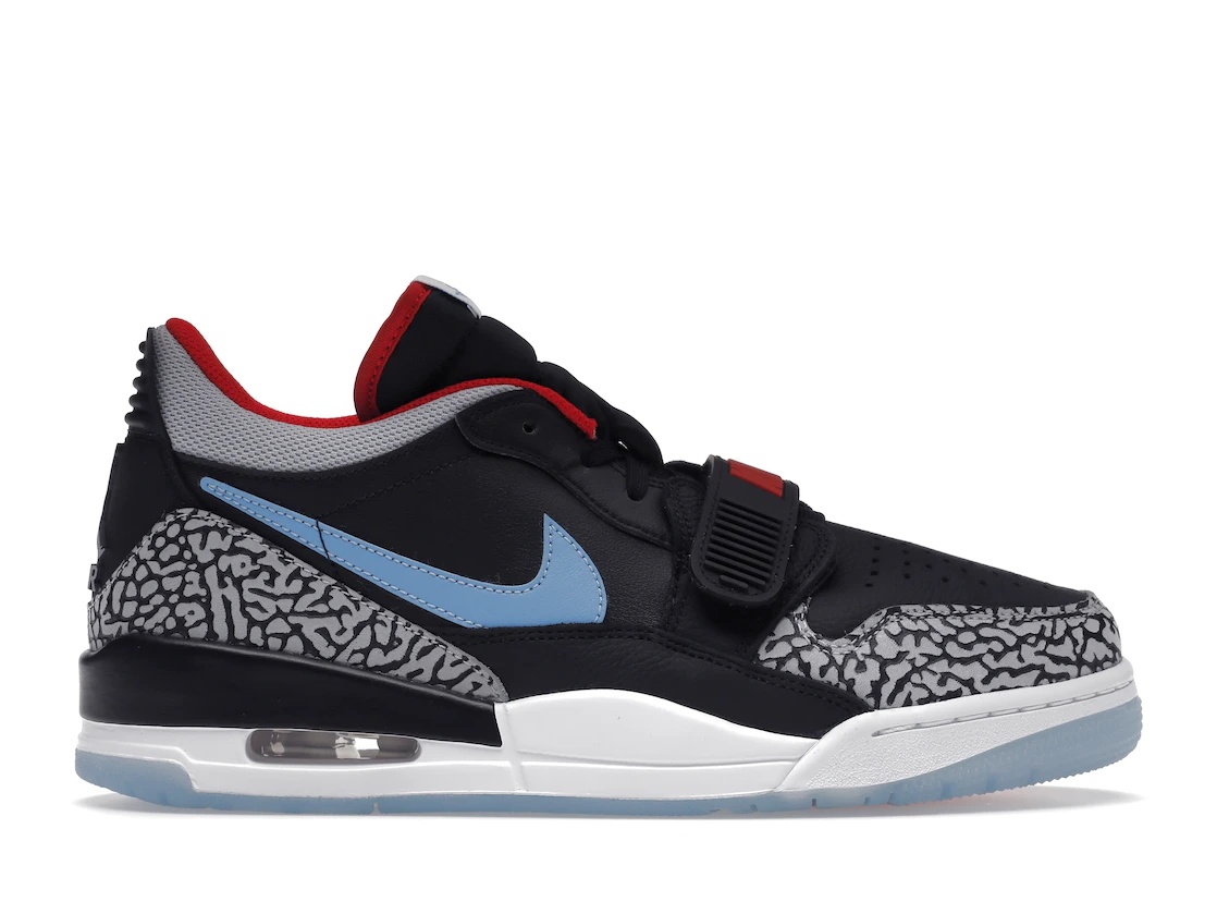 The Jordan Legacy 312 Low Black Valor Blue combines elements of the Air Jordan 1, the Air Jordan 3, and the Nike Air Alpha Force Low – featuring a color scheme inspired by the Chicago flag. The Low-Top Jordan Legacy 312 comes in a black/Valor Blue/University Red/Wolf Gray colorway, and sports an upper of black tumbled leather with contrasting leather Swooshes, blue on the lateral side, and red on the medial. Elephant-Print Gray leather overlays the heel and the perforated toebox. The collar is gray mesh with a red sock liner, the laces are black, and the mudguard is black and white. The white foam midsole has a visible Air unit, and the rubber outsole is red, white, and Translucent Blue. What we love most about this shoe is all the branding, including a gray Jumpman and "Air" on a black heel tab, a black Jumpman on a blue insole, a blue Wings logo on a white tongue tab, a red "Nike" on the black midfoot strap, and "Jordan" in black on the white rubber of the outsole. The Jordan Legacy 312 Low Black Valor Blue was released on April 24, 2022, for $130 retail. - Style CD7069-004 - Colorway Black/Valor Blue/University Red/Wolf Gray - Retail Price 130 - Release Date 2022-04-24 - Featured false