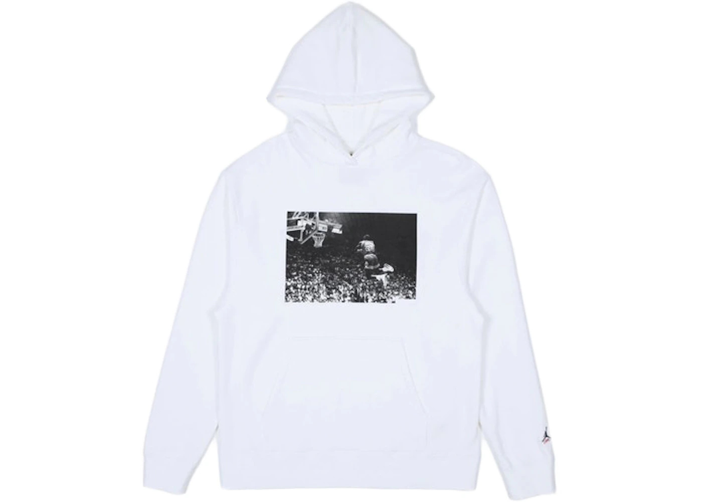The Jordan x Union Flying High Hooded Sweatshirt White captures a redefining moment in the basketball world when Michael Jordan made a dunk from the free-throw line during the Slam Dunk Contest 1988. The upper section of the Jordan x Union Flying High Hooded Sweatshirt has a hood in a plain white color without embellishments. However, the chest has the black imprint of a basketball event. It shows a young Michael Jordan in midair, with eyes trained on the ring in readiness for a successful score. Most of the hoodie’s parts are plain, except the left sleeve and the back. A black Jumpman silhouette and a red classic font Union are embroidered near the left cuff. On the back, black Union logo embroidery appears atop a red AIR JORDAN branding. Among the most outstanding features of this hoodie is its black and red logos that nod to the collaboration between the Air Jordan brand and Union. The Jordan x Union Flying High Hooded Sweatshirt White was released on August 29th, 2020, for $100. - Season FW20 - Color White - Release Date 2020-08-29 - Retail Price 100 - Featured false