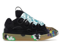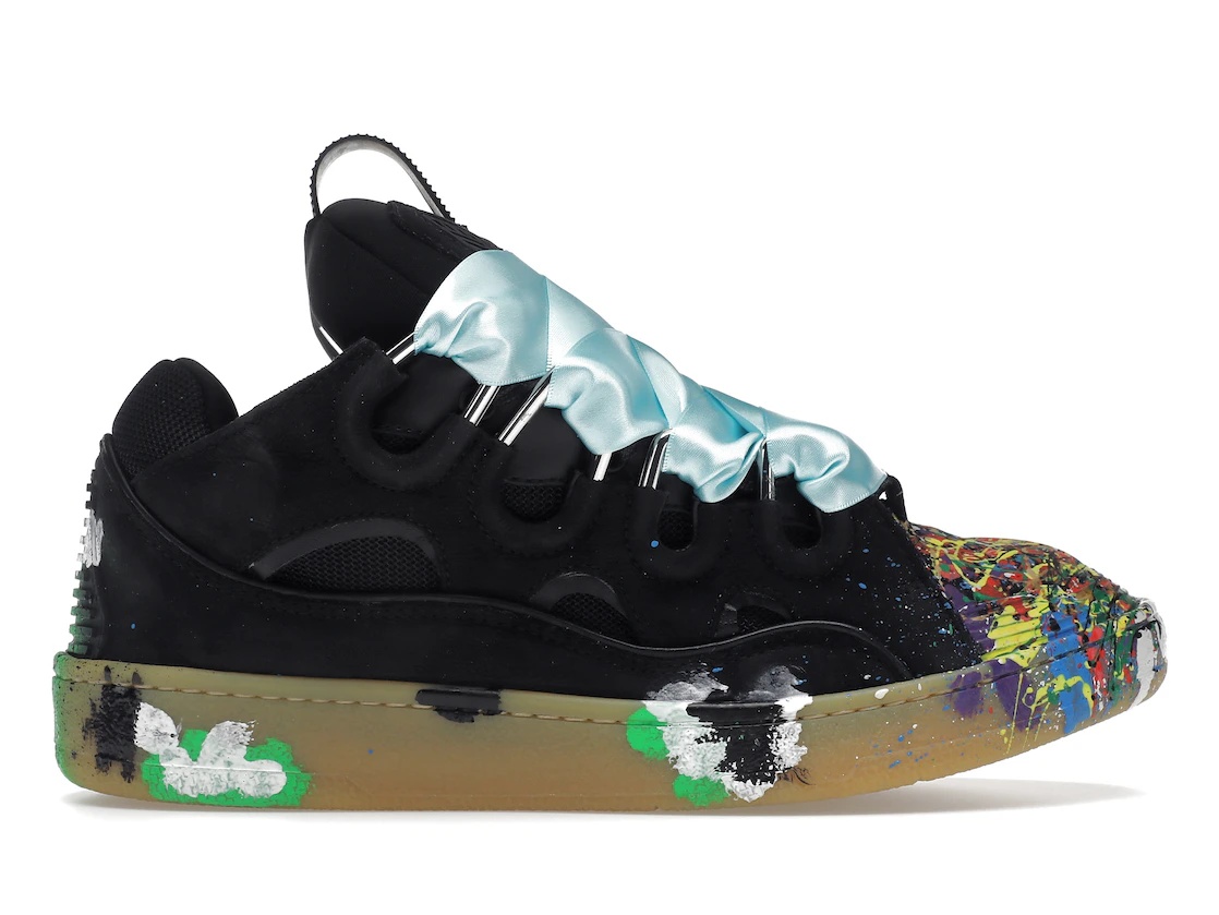 The Lanvin Leather Curb Gallery Dept. Black Multi is an athletic shoe featuring a black suede upper with oversized laces and eyestays. The laces are aqua ribbons, held by black and silver metal stays, contrasted by a gum rubber sole. Multicolored paint splatters adorn the tip and areas around the midsole. A black tongue pull tab completes the look. French brand Lanvin was founded in 1889 and has the distinction of being the longest existing fashion house in French history. In more recent years, Lanvin has been led by Director Siddhartha Shukla and Designer Bruno Sialelli, who oversaw this foray into Curb Sneakers, a signature style on which the brand improvises frequently. Our experts feel that the best feature of the Leather Curb is its freeform paint splatters, which create an expressive yet elevated aesthetic. The Lanvin Leather Curb Gallery Dept. Black Multi released on April 1, 2022, and retailed at $1420. - Style FM-SKRK11-DRGD-P2210S1 - Colorway Black/Multi - Retail Price 1420 - Release Date 2022-04-01 - Estimated Retail Price 600 - Featured false