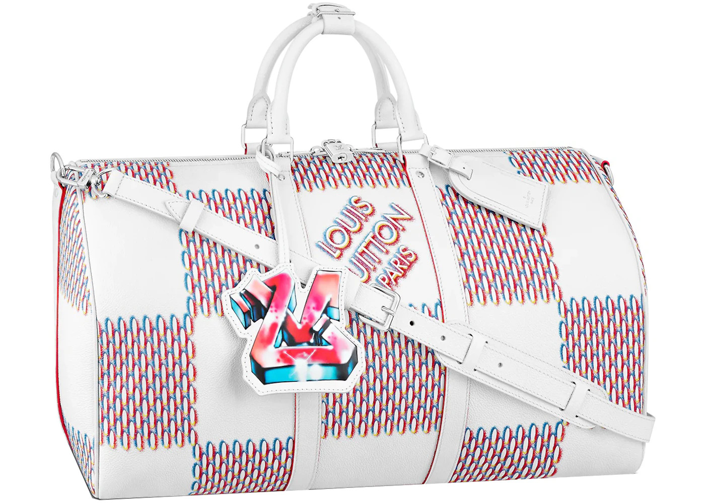 Louis Vuitton Keepall 50B White Damier Spray, Style Number M20563. Please Note: This item comes with a dust bag, the box is not required. - Dimensions 11.4H 19.7W 9.1D - Material Cowhide Leather - Retail Price 4200 - Color White Damier Spray - Hardware Silver-tone - Release Date 2022-05-13 - Style M20563 - Included Accessories Strap, Lock, Key, Lock Cover, Luggage Tag, Handle Strap, Dust Bag - Season SS22 - Base Model Keepall - Base Model Variety 50B - Color Generic White - Depth 9.1 - Featured false - Height 11.4 - Styles Top Handle - Width 19.7