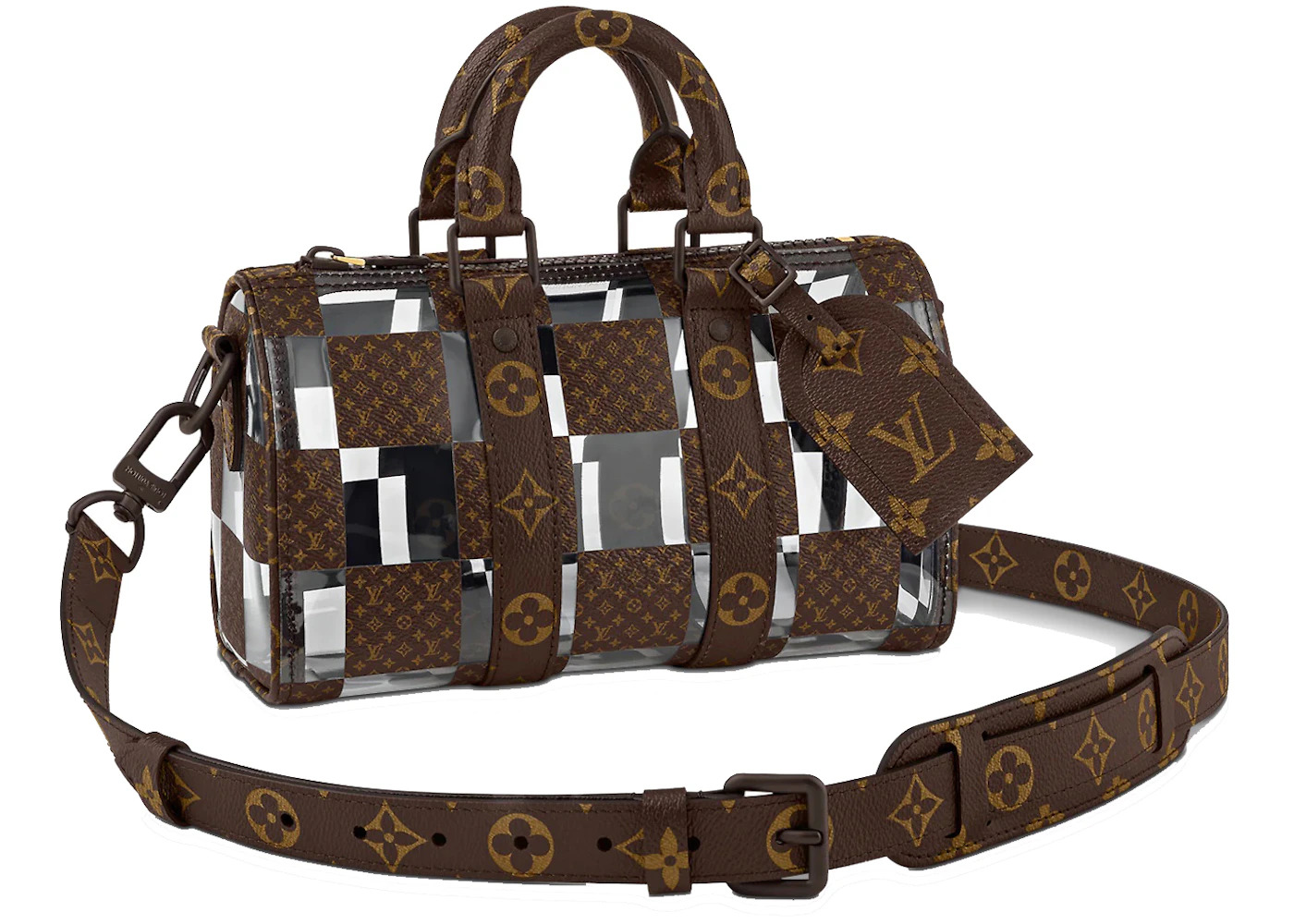 Please Note: This item comes with a dust bag, the box is not required. - Dimensions 5.9H 9.8W 4.3D - Material Coated Canvas/PVC - Retail Price 3250 - Color Brown/Clear - Release Date 2022-07-14 - Style M20872 - Included Accessories Strap, Lock, Key, Lock Cover, Luggage Tag, Handle Strap, Dust Bag - Season SS22 - Base Model Keepall - Base Model Variety Bandouliere 25 - Color Generic Brown - Depth 4.3 - Featured false - Height 5.9 - Styles Crossbody - Width 9.8