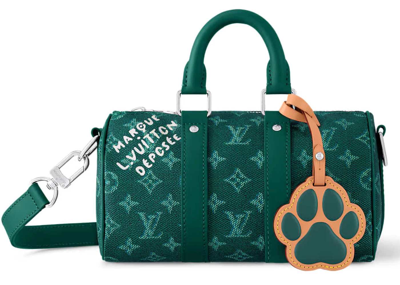 Please Note: This item comes with a dust bag, the box is not required. - Dimensions 5.9H 9.8W 4.3D Strap 24.8 - Material Coated Canvas - Retail Price 2650 - Color Green - Hardware Silver-tone - Size 25 - Release Date 2024-10-31 - Style M12684 - Included Accessories Removable Paw Charm, Removable and Adjustable Strap - Season SS25 - Base Model Keepall - Base Model Variety Bandouliere - Color Generic Green - Depth 4.3 - Featured false - Height 5.9 - Requester Rachel M - Strap Drop 24.8 - Styles Duffle - Uploaded By ML - Width 9.8