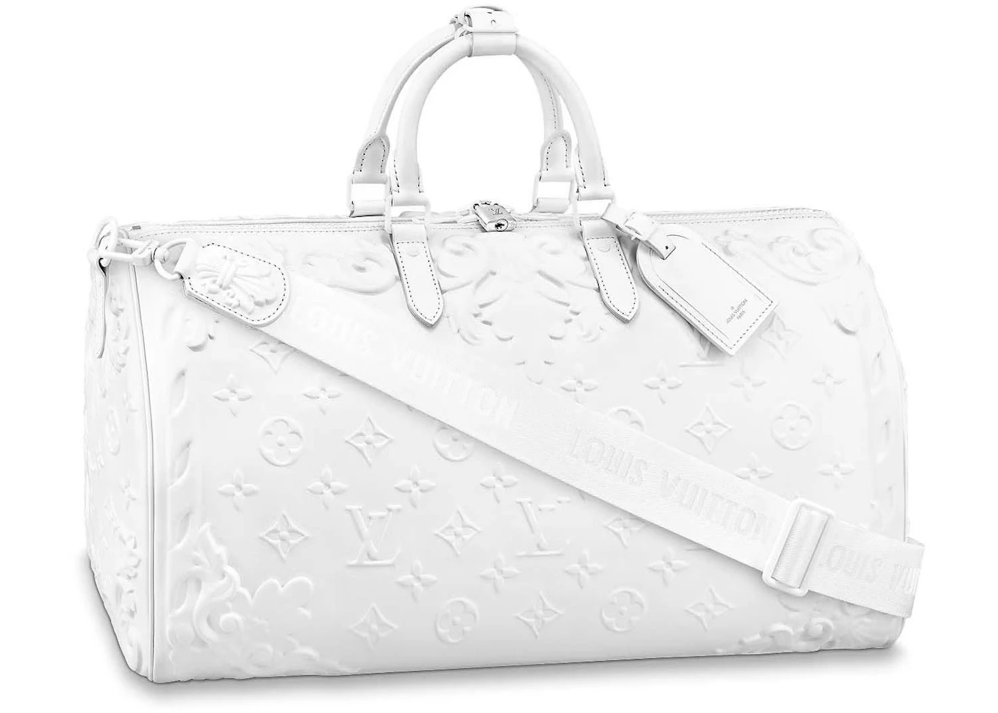 Louis Vuitton Keepall Bandouliere 50 Optic White, Style Number M21845. This product released for 4600 USD, made from Calfskin Leather and accompanied with Tone-on-tone Hardware. Please Note: This item comes with a dust bag, the box is not required.Louis Vuitton no longer utilizes visible date codes for handbags and accessories produced in 2021 and going forward. - Dimensions 11.4H 19.7W 9.1D Strap 19.7 - Material Calfskin Leather - Retail Price 4600 - Color Optic White - Hardware Tone-on-tone - Size 50 - Release Date 2023-01-24 - Style M21845 - Included Accessories Strap, Lock, Key, Lock Cover, Luggage Tag, Handle Strap, Dust Bag - Season SS23 - Base Model Keepall - Base Model Variety Bandouliere - Color Generic White - Depth 9.1 - Featured false - Height 11.4 - Strap Drop 19.7 - Styles Duffle - Width 19.7