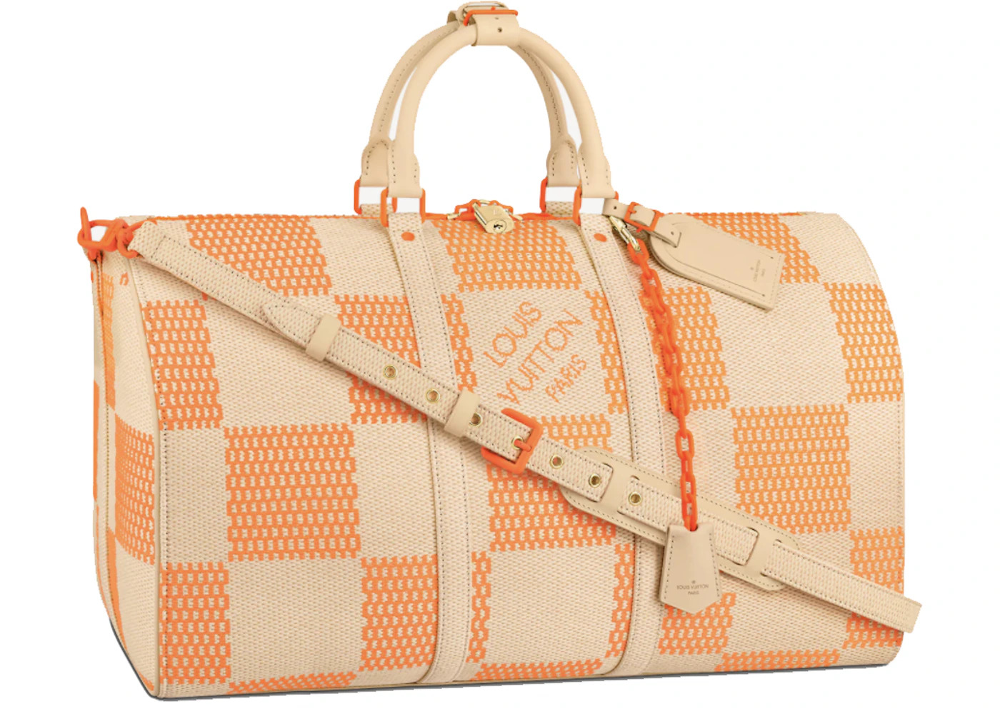 Please Note: This item comes with a dust bag, the box is not required. - Dimensions 11.4H 19.7W 9.1D Strap 19.7 - Material Woven Raffia - Retail Price 5850 - Color Orange - Hardware Orange-tone - Size 50 - Style M57419 - Included Accessories Strap, Lock, Key, Lock Cover, Luggage Tag, Handle Strap, Dust Bag - Season SS21 - Base Model Keepall - Base Model Variety Bandouliere - Color Generic Orange - Depth 9.1 - Featured false - Height 11.4 - Interior Color Brown Canvas Interior Lining - Pattern Damier Canvas - Strap Drop 19.7 - Styles Duffle,Travel - Width 19.7