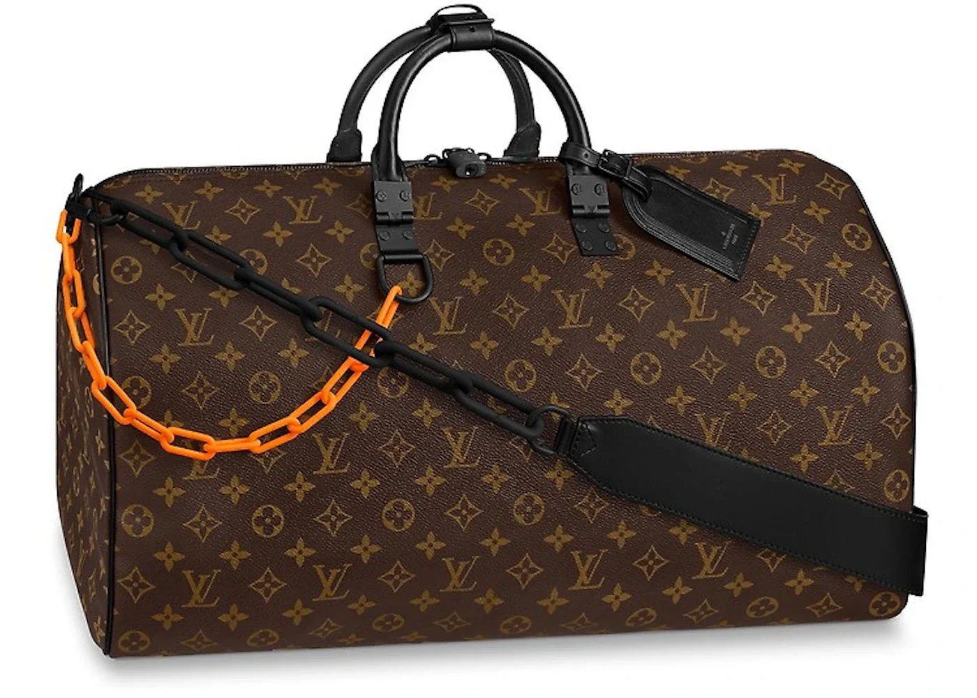 Virgil Abloh’s highly anticipated debut as the men’s art director for LV’s Spring Summer 2019 collection is finally here. The Louis Vuitton Keepall 50 features the classic monogram print in a coated calfskin canvas with matte black detailing and piping. Bright orange and black matted chain links are latched onto the handle and to the cross body for a cool take on the classic duffle.Please Note: This item comes with a dust bag, the box is not required. - Dimensions 19.7 H 11.4W 8.7D - Material Coated Canvas - Retail Price 3850 - Color Brown - Hardware Orange/Black-tone - Style M44471 - Included Accessories Strap, Lock, Key, Lock Cover, Luggage Tag, Handle Strap, Dust Bag - Season SS19 - Base Model Keepall - Color Generic brown - Depth 8.7 - Featured false - Height 19.7 - Pattern Monogram - Styles Duffle - Width 11.4