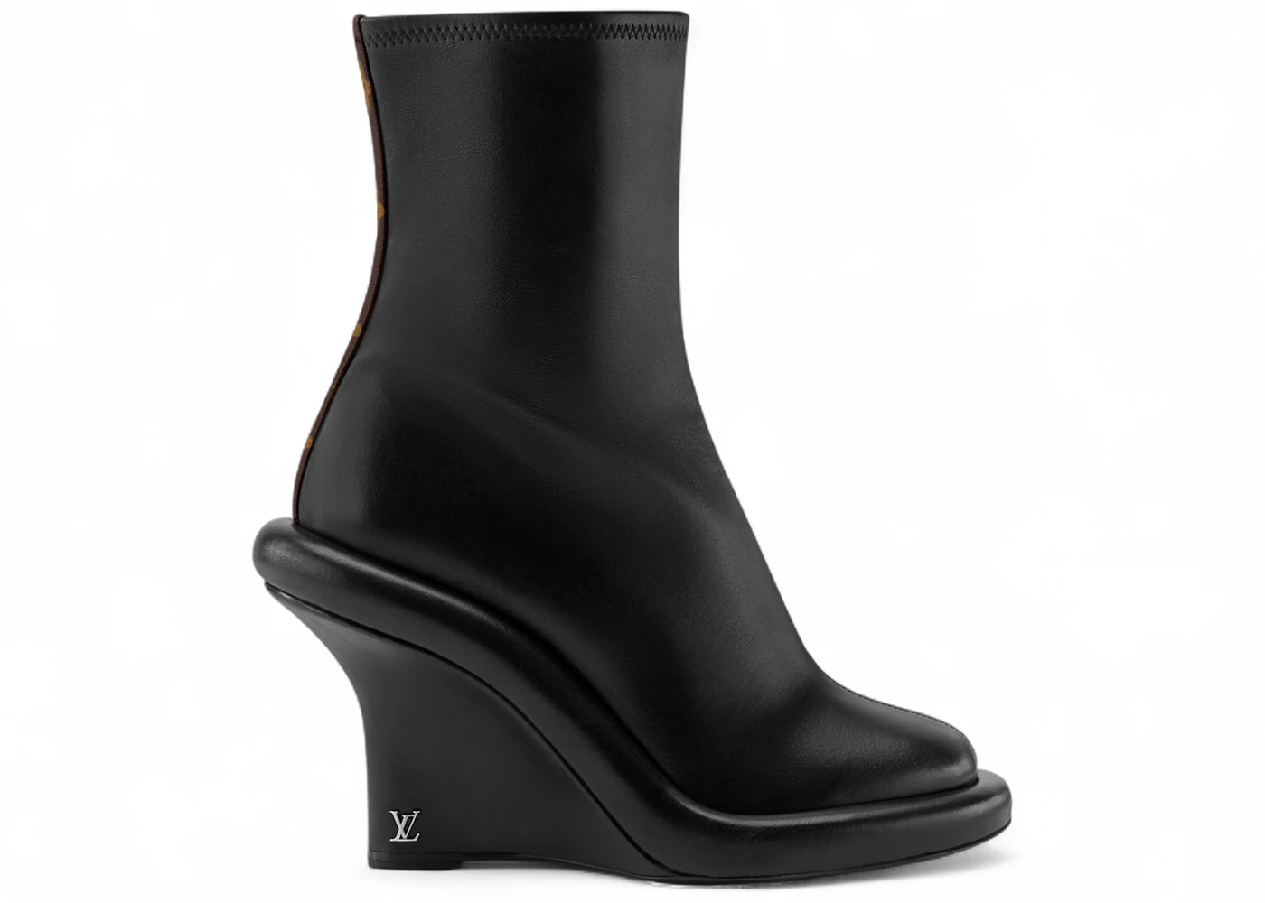 Louis Vuitton Lounge Wedge Ankle Boots Black Leather Monogram Canvas (Women's)