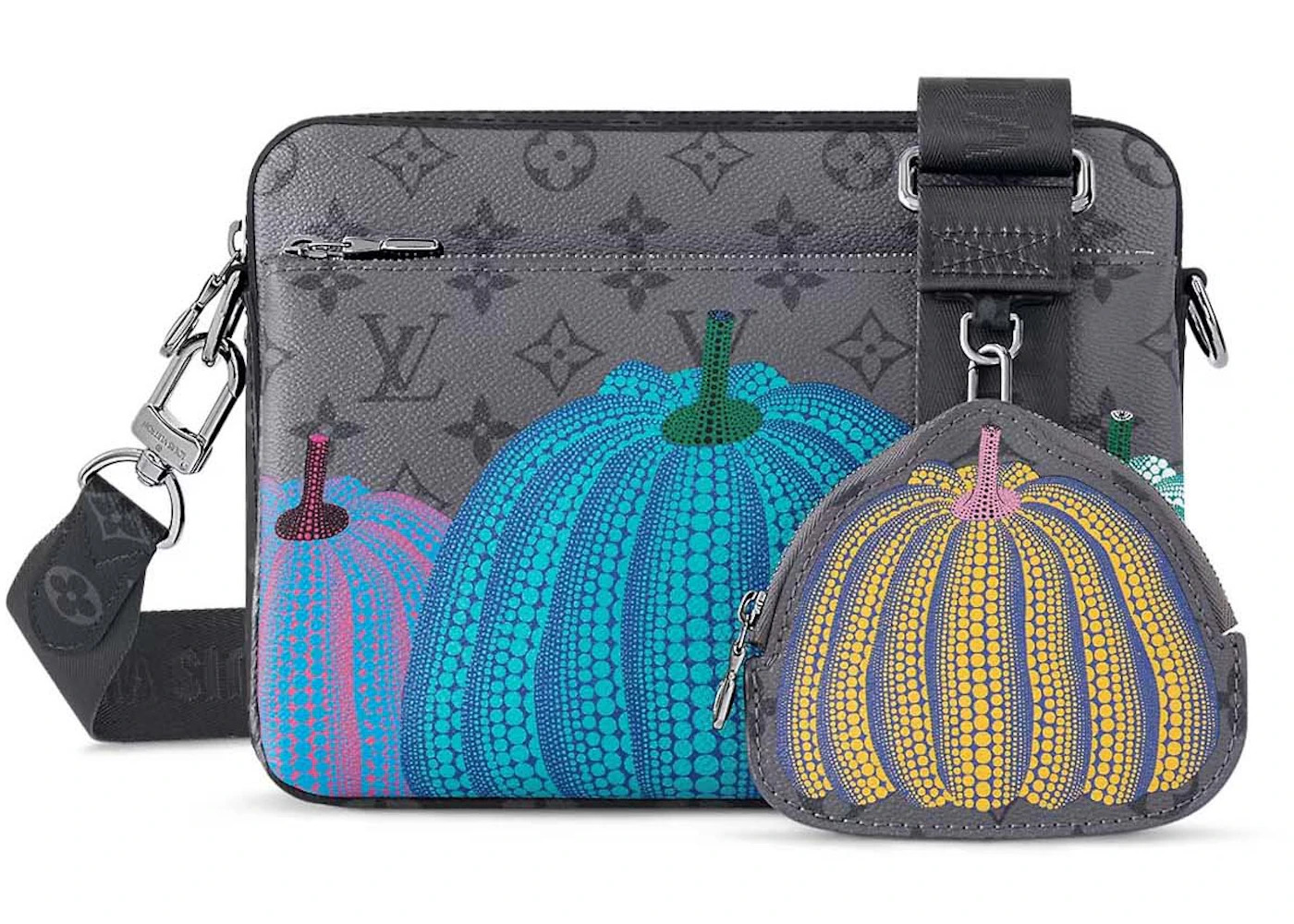 Please Note: This item comes with a dust bag, the box is not required. - Dimensions 7.3H 9.8W 2.8D Strap 25.2 - Material Monogram Eclipse Reverse Coated Canvas - Retail Price 3150 - Color Pumpkin Print - Hardware Ruthenium-tone - Release Date 2023-03-31 - Style M46435 - Season SS23 - Base Model LV x YK Trio - Base Model Variety Messenger - Color Generic Multicolor - Depth 2.8 - Featured false - Height 7.3 - Strap Drop 25.2 - Styles Messenger - Uploaded By ML - Width 9.8