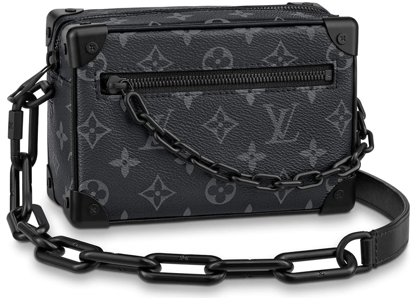 Please Note: This item comes with a dust bag, the box is not required. - Dimensions 5.12H 7.2W 3D - Material Coated Canvas/Leather - Retail Price 3100 - Color Black - Hardware Matte Black Resin - Style M44735 - Included Accessories Strap, Dust Bag - Season FW19 - Base Model Soft Trunk - Color Generic Black - Depth 3.15 - Featured false - Height 5.12 - Interior Color Black Textile Lining - Pattern Monogram - Pattern Variant Eclipse - Styles Shoulder Bag - Width 7.28