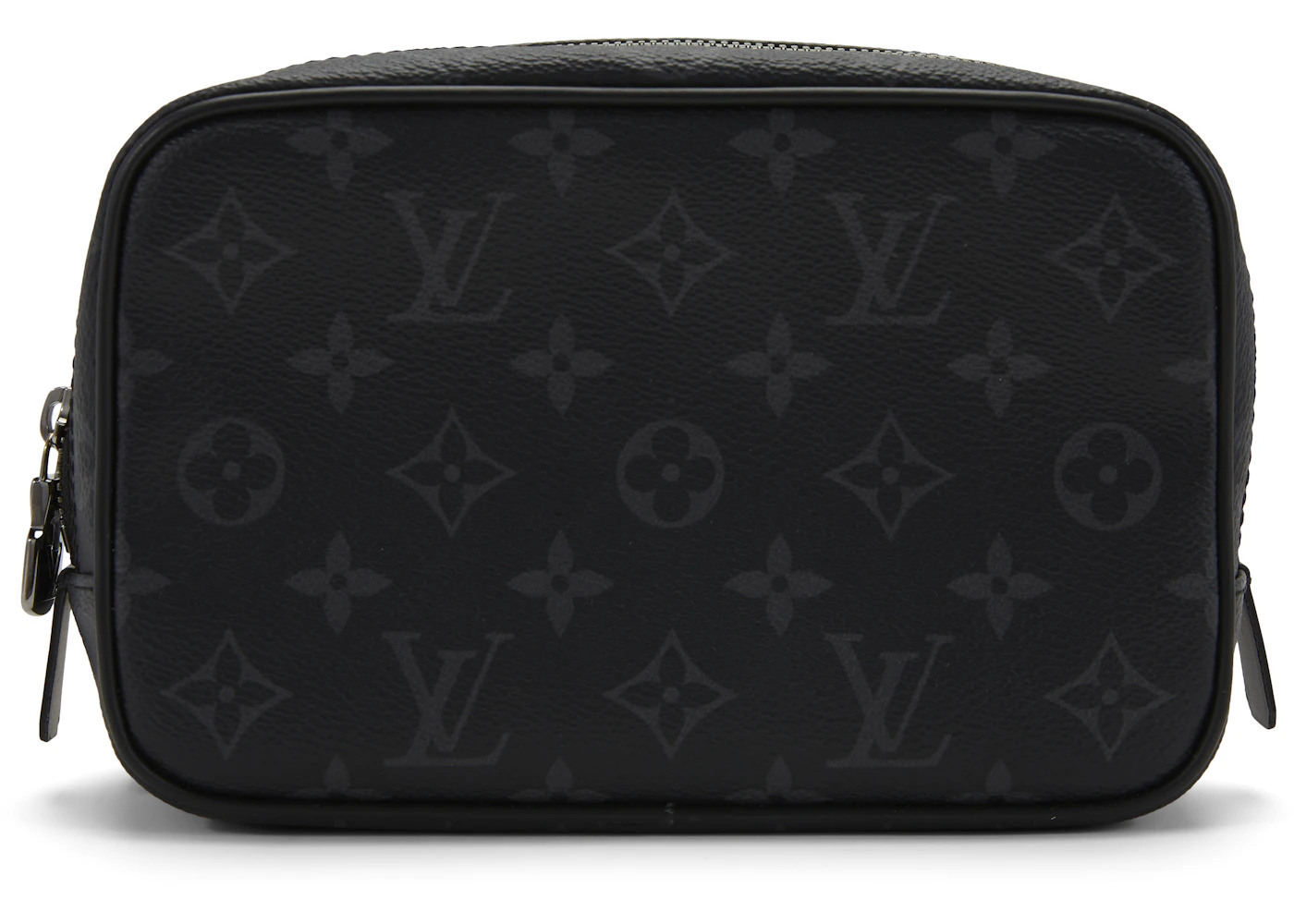 Please Note: This item comes with a dust bag, the box is not required. - Dimensions 5H 8W 2.5D - Material Coated Canvas/Cowhide Leather - Retail Price 605 - Color Black/Grey - Hardware Silver-tone - Style M43384 - Base Model Pouch - Base Model Variety Toiletry - Color Generic Black - Depth 2.5 - Featured false - Height 5 - Interior Color Black Washable Synthetic Lining - Pattern Monogram Eclipse - Styles Pouch - Width 8