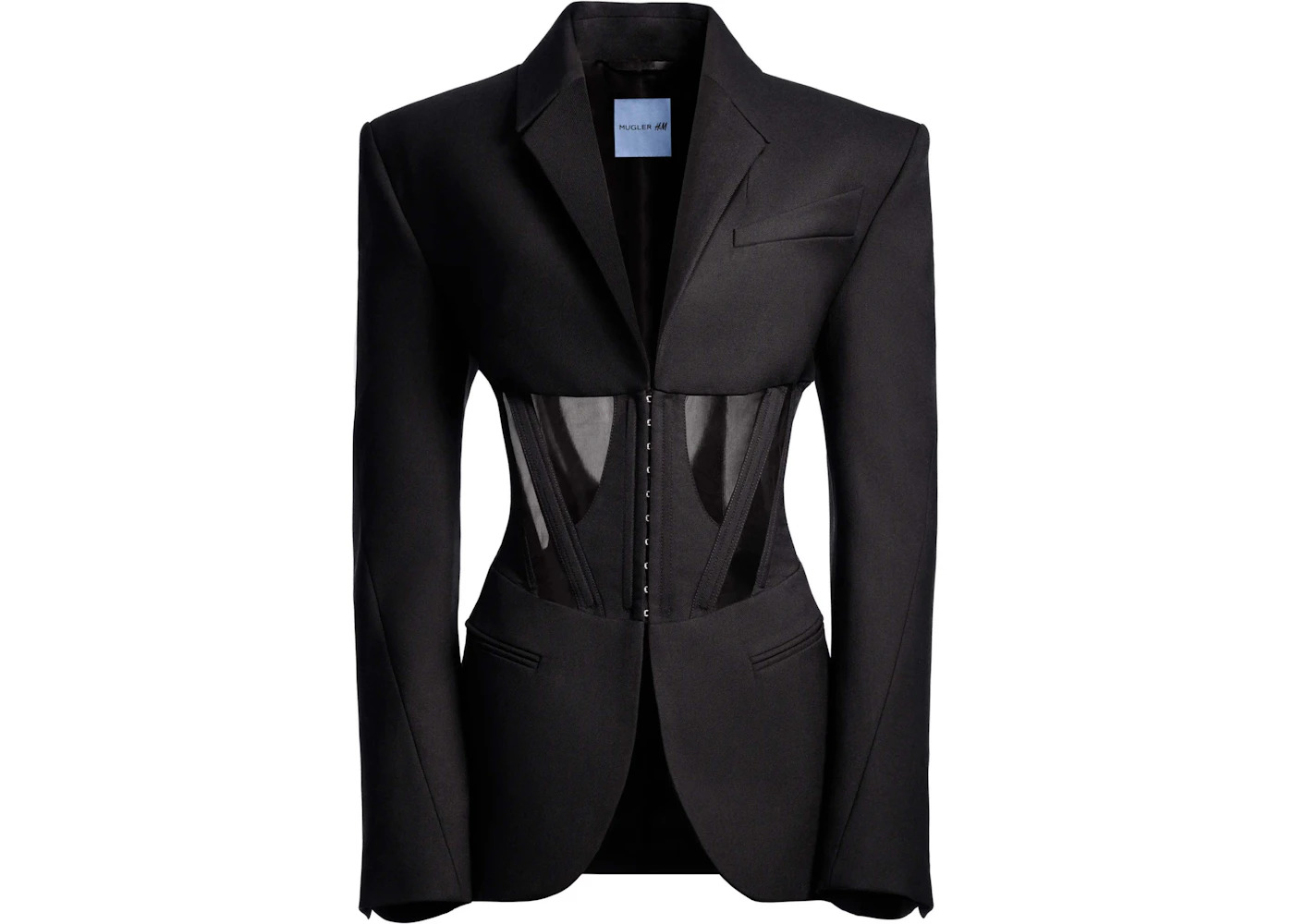 Mugler H&M Corset Style Wool Jacket Black features a sharp-tailored design crafted from wool twill, complete with striking shoulder pads that accentuate the silhouette. A corset detail made of mesh, featuring boning and hidden hook-and-eye fasteners, adds a classic touch. The Mugler H&M Corset Style Wool Jacket Black is adorned with a pointed collar, notched lapels, and extra-long sleeves with buttoned cuffs. Additionally, the Mugler H&M Corset Style Wool Jacket Black was released May 11, 2023 with a retail price of $349.Please reference wash tag for accurate sizing. - Season SS23 - Color Black - Release Date 2023-05-11 - Retail Price 349 - Featured false - Uploaded By ML