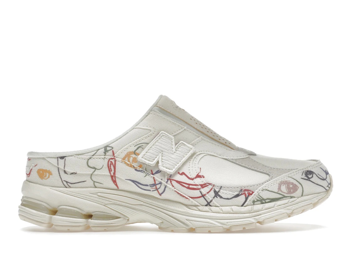 In a mule iteration of the New Balance 2002R, The New Balance 2002R Mule Bryant Giles What Now? features a cream canvas upper with faded multi color illustrations, frayed overlays, and removable velcro New Balance side patches. "What Now?" embroidery on the heel pays tribute to Giles' 2019 film What Now? that debuted in December of 2021 at Art Basel in Miami. From there, custom insoles displaying Giles' paintings and a semi-translucent outsole complete the design. The New Balance 2002R Mule Bryant Giles What Now? released in July of 2022 and retailed for $140. - Style M2002RM1 - Colorway Beige/Moonbeam - Retail Price 140 - Release Date 2022-07-14 - Included Accessories Removable "N" patch - Featured false