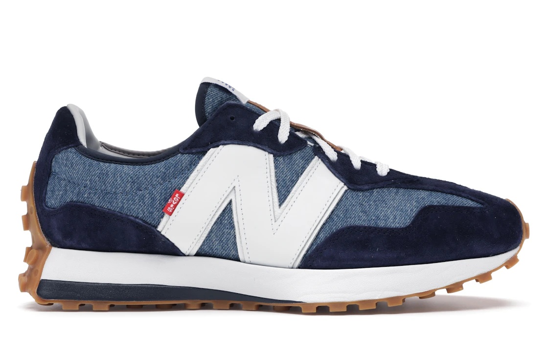 The New Balance 327 Levi's Navy features a navy and white standard leather, suede, nylon, and denim upper, with the denim acting as a light blue base. From there, standard leather adorns the New Balance 327 silhouette in the form of the oversized New Balance graphic in white and a full tread outsole in tan Gum serves to complete the design. The New Balance 327 Levi's Navy released in November of 2020 and retailed for $130. - Style MS327LVA - Colorway Navy/White - Retail Price 130 - Release Date 2020-11-09 - Featured false