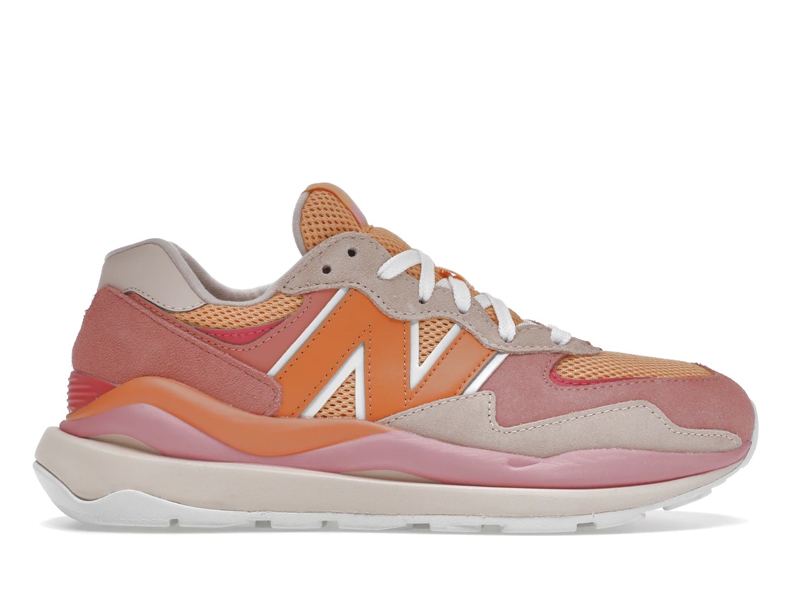 Inspired by the holiday of love, the New Balance 57/40 Valentine's Day (W) is a sneaker from the New Balance 57/40 collection in a Pink/Orange colorway. This offering features an upper made of an Orange mesh base on the toe box, mid-panel, ankle collar, and tongue with Pink suede overlays on the forefoot, heel, and collar. A contrasting Tan tone also appears on the forefoot side panels and eyestays. Leather accents appear on the heel tab and the Orange ‘N’ logo. Heart-shaped perforations on the side panels in an Orange/Light Pink hue, a Beige midsole, and an Off-White rubber outsole complete the design. The New Balance 57/40 Valentine's Day (W) was released on May 5th, 2022, for a retail price of $100. - Style W5740VDA - Colorway Pink/Light Pink/Orange - Retail Price 100 - Release Date 2022-05-05 - Featured false