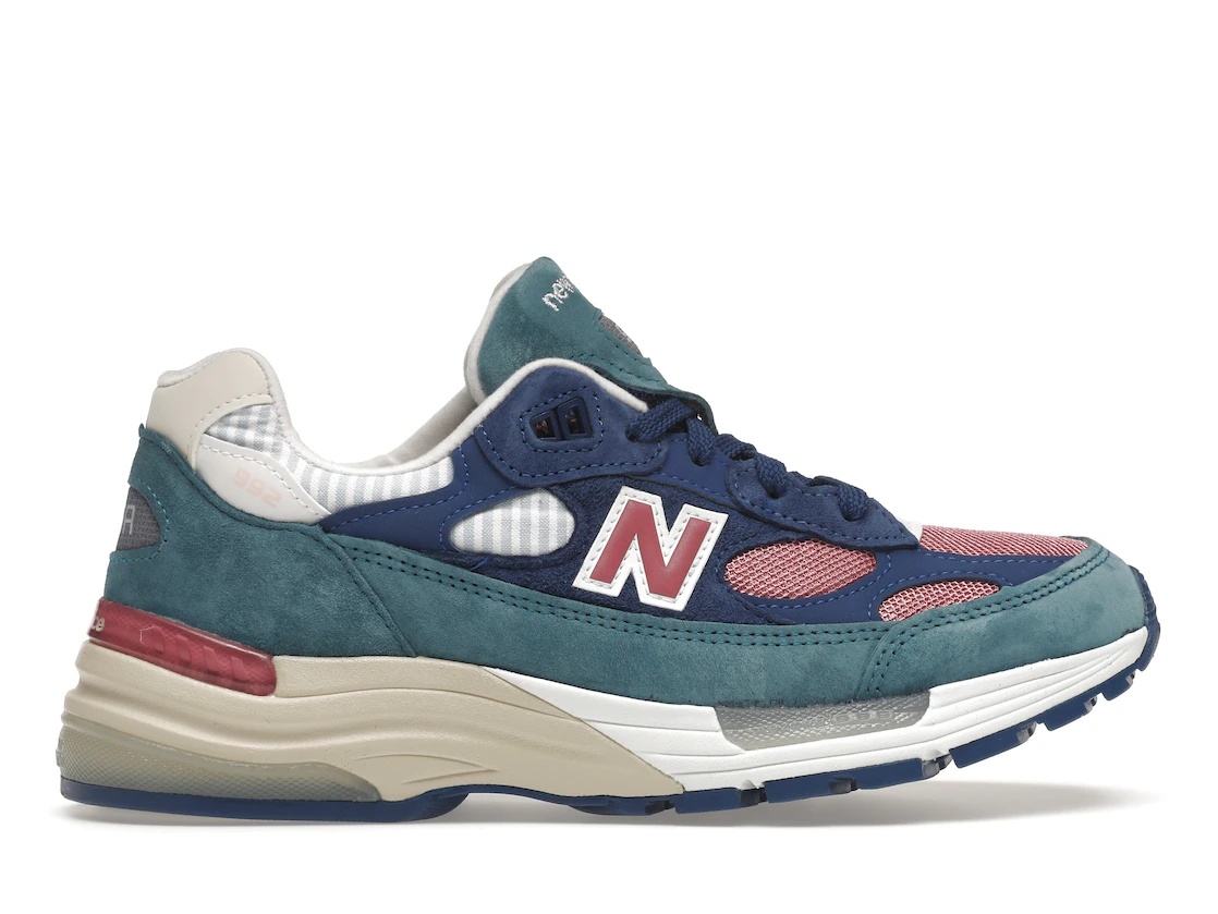 The New Balance 992 Blue Teal Rose utilizes a range of color schemes in its sueded and meshed upper. The upper shoelace area and along the heel counter extending to the mudguards are dark blue and light blue color tones respectively. The upper is also accented with pink meshed patches while featuring a white checked hue on the collar and atop the heel section. Brandings are dressed in pink below the heel counter and side panels, while a neutral trait is found on the USA embroidery with a grey fence at the heel tab. The EVA cushioned midsole completes the sneaker's look. The New Balance 992 Blue Teal Rose was released on the market on January 5th, 2020, and retailed at $190. - Style M992NT - Colorway Blue/Teal-Rose - Retail Price 190 - Release Date 2020-05-01 - Featured false