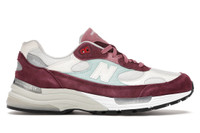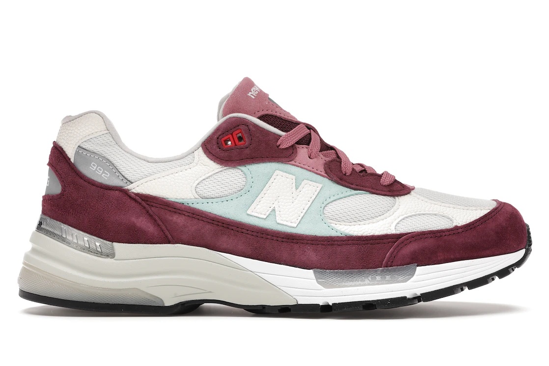 The New Balance 992 Kith Kithmas Burgundy White was released as part of the three-piece "Kithmas Collection," in collaboration with New Balance and Kith. An airy white mesh serves as the foundation of the upper, which is strengthened with burgundy pigskin suede on the eye stay and mudguard, while a teal hue is dressed on its quarter panel. The 'N' logo is embroidered in off-white pebbled leather and embossed on top of a pale turquoise suede overlay. A 'Fieg' heel engraving honors the brand's founder, while Kith branding appears on the tongue. The New Balance 992 Kith Kithmas Burgundy White was released on 25th December 2020 and retailed at $185. - Style M992KB - Colorway Burgundy/White/Teal - Retail Price 185 - Release Date 2020-12-25 - Featured false