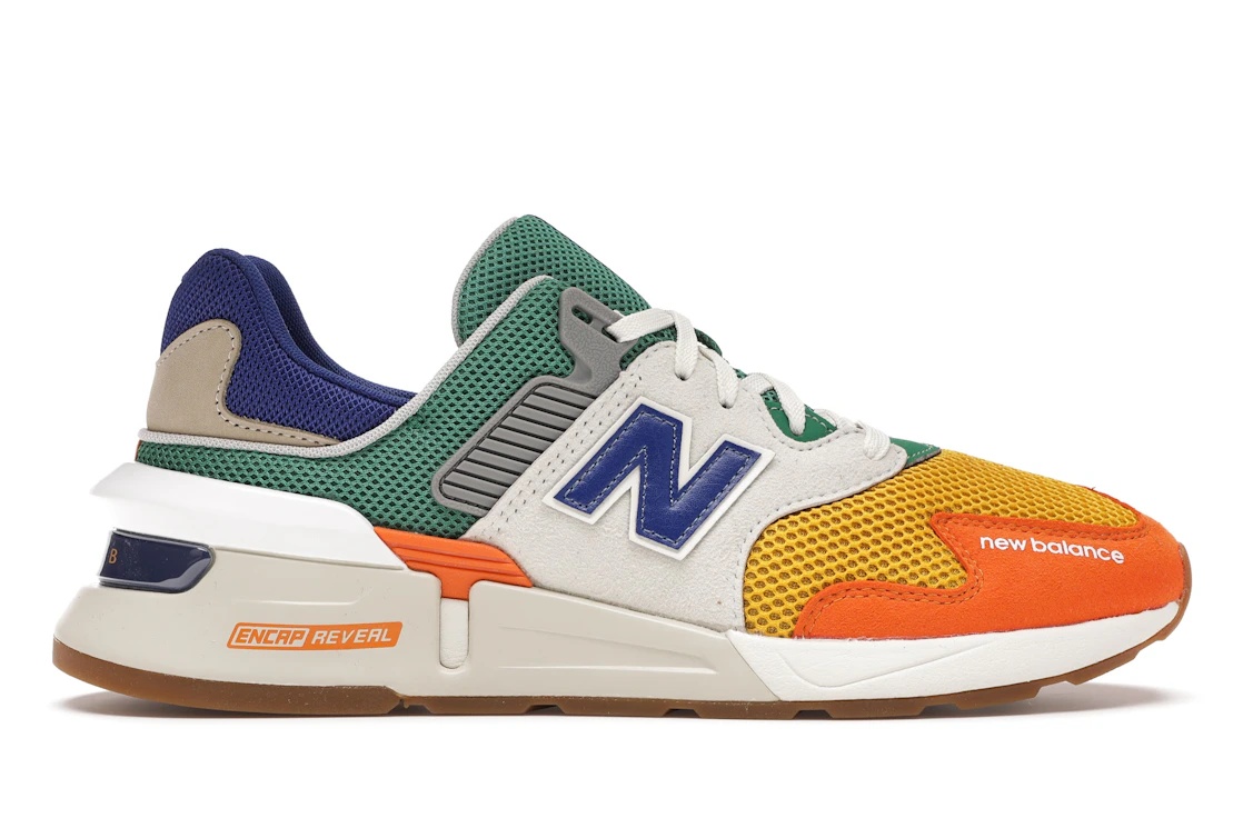 The New Balance 997S Multi comes in an orange, mustard-green, and blue colorway. The Multi New Balance 997S features an upper that is constructed from a durable and breathable blend of suede, mesh, and synthetic overlays. The midsole features New Balance's ENCAP and ABZORB technologies for cushioning and impact reduction. The rubber outsole provides grip and traction. The sneaker has a padded tongue and collar for support and comfort. The shoe features "N" on the sides, "997S" on the tongue, and "new balance" lettering on the toe cap. The New Balance 997S Multi was released on December 1, 2019, and retailed for $110. - Style MS997JHX - Colorway Orange/Mustard-Green-Blue - Retail Price 110 - Release Date 2019-12-01 - Featured false