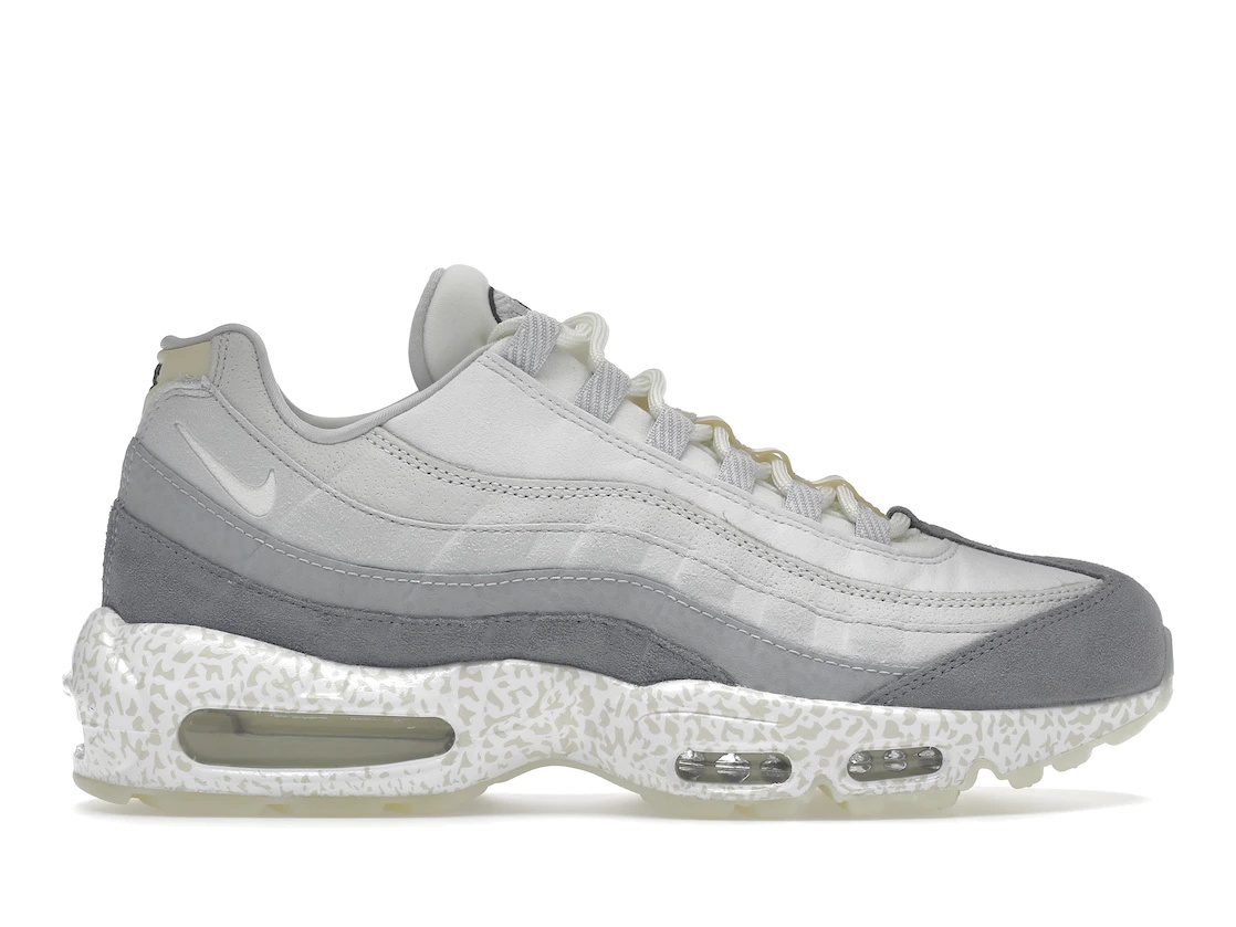 The Air Max 95 Light Bone GID comes dressed in a mixture of different hues, with Cool Gray, Light Bone, and Summit White being the dominant tones. This Light Bone GID Air Max 95 embraces an anatomically-inspired design by incorporating skeletal hues on the leather as well as on the suede upper. The wavy side overlays have a gradient effect, shifting to gray from off-white. The midsole, which is crafted from a patterned polyurethane, offers lightweight cushioning and showcases visible Max Air units in both the forefoot and heel. The milky rubber outsole features an illustrated graphic of a skeletal hand, adding an artistic touch to the shoe's overall appearance. Our experts found a milky rubber of this sneaker as the most eye-catching feature. The Air Max 95 Light Bone GID hit the market for the first time on June 23rd, 2022 with a suggested retail value of $155. - Style DV2593-100 - Colorway Summit White/Light Bone-Cool Grey - Retail Price 155 - Release Date 2022-06-23 - Featured false