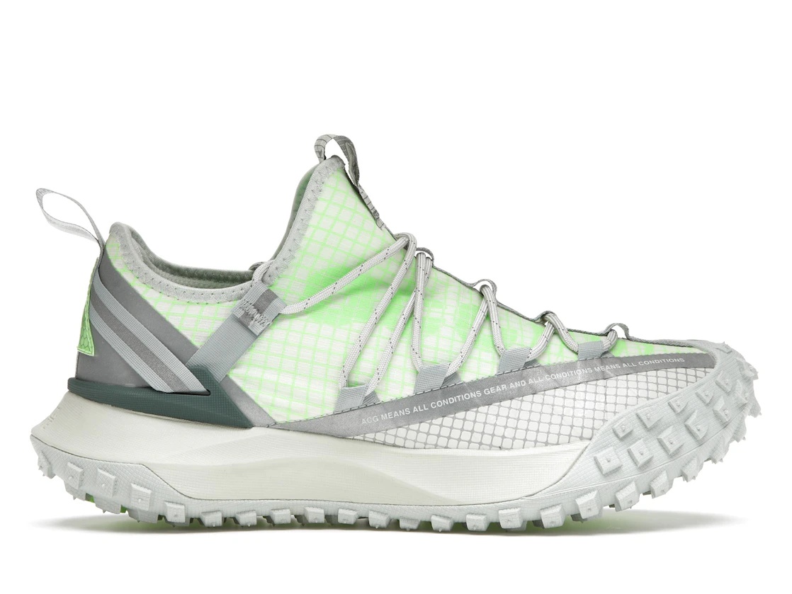 The Nike ACG Mountain Fly Low Sea Glass is a low-top shoe specifically designed to withstand various conditions, especially rugged terrains. Featuring a Sea Glass and Lime Blast color palette, the Nike ACG Mountain Fly Low boasts a vibrant and attention-grabbing appearance. Its lightweight upper is complemented by an easy-use gaiter, allowing personalized adjustments on the move. The outdoor-oriented silhouette features a sturdy, lugged rubber outsole that wraps around the forefoot, offering reliable multidirectional traction in any weather or terrain. The off-white midsole houses Nike React foam, ensuring a plush and cushioned ride. Atop the shoe, vivid lime green rope laces secure a bootie-style textile upper, ensuring a snug fit as they are tightened. Reflective detailing adorns the sneaker’s no-sew overlays and webbing pull tabs, enhancing visibility in low-light settings. The standout characteristic of the Nike ACG Mountain Fly Low Sea Glass lies in its distinctive wide lacing system running from the middle down both sides. This feature significantly enhances foot stability and provides superior control during wear. The sneaker debuted for $180 on June 7, 2021. - Style DJ4030-001 - Colorway Sea Glass/Lime Blast - Retail Price 180 - Release Date 2021-06-07 - Featured false - Product Line Nike ACG