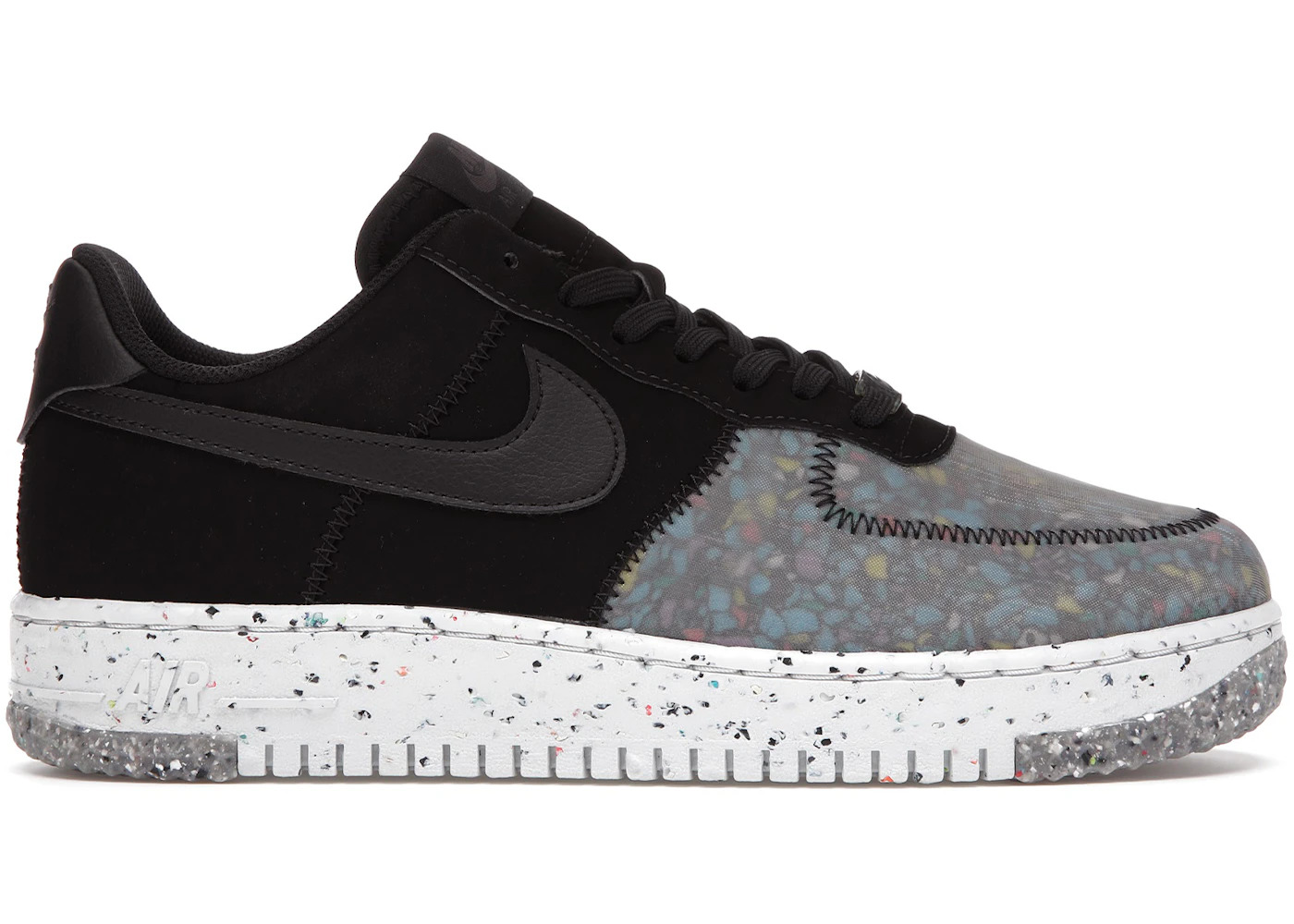 The Nike Air Force 1 Crater Recycled Black builds this iconic silhouette using partially recycled materials and creates a shoe that is as forward-thinking as it is fashion-forward. The upper of this sustainable sneaker features recycled textile on the forefoot that has a translucent sheen that reveals multicolored pebble-like graphics underneath. The eyestays and the back of the shoe are crafted from black textiles. The heel tab and the Nike swoosh on the side panel are synthetic black leather. Black deco stitching circles the toe box and connects the pieces of the upper together. A white midsole of 11% recycled Crater Foam features colored speckles that echo the forefoot of the upper. This environmentally conscientious shoe rides on a sole of speckled white rubber and recycled Nike grind in speckled gray. Our favorite aspect of this shoe are the secret pops of yellow that land on the insoles. The Nike Air Force 1 Crater Recycled Black was released on May 13, 2021, for a retail price of $110. - Style CZ1524-002 - Colorway Black/Photon Dust-Dark Smoke Grey-Black - Retail Price 110 - Release Date 2021-05-13 - Featured false - Product Line Nike Air Force
