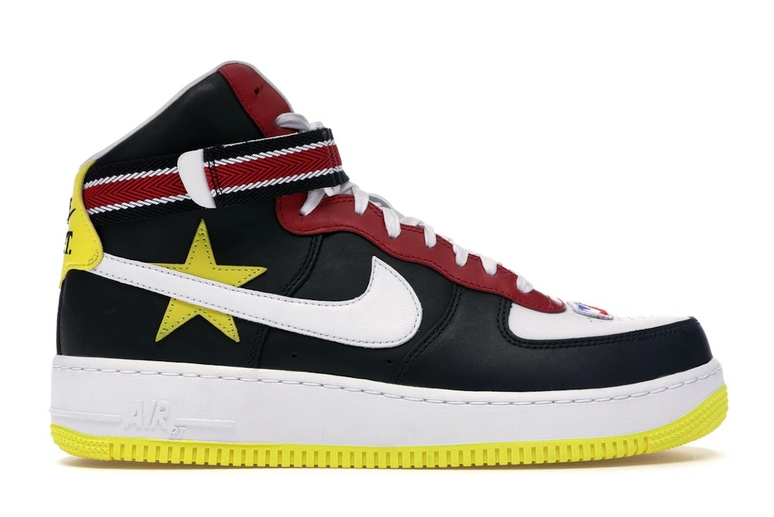 The Nike Air Force 1 High Riccardo Tisci All Star 2018 Black is a limited edition sneaker that combines the iconic Air Force 1 silhouette with the creative vision of designer Riccardo Tisci. The shoe features a sleek black leather upper with a bold white Nike Swoosh and a contrasting red and blue ankle strap. The high-top design provides added support and style, while the Air-Sole unit in the heel offers cushioning and comfort. The release date for this shoe was February 16, 2018, and it retailed for $220. The premium materials and attention to detail make this sneaker a must-have for collectors and fans of the Air Force 1. - Style AQ3366-600 - Colorway Gym Red/Opti Yellow-Black-White - Retail Price 220 - Release Date 2018-02-16 - Featured false - Product Line Nike Air Force