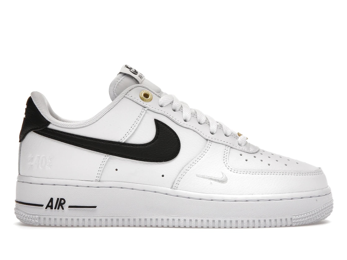 The Nike Air Force 1 Low 07 LV8 40th Anniversary White Black is dressed in different color schemes, with metallic gold, black, and white coming as the main tones. The upper of this Low Nike Air Force 1 sneaker is made of white leather material with blacked-out heel tabs. The Nike logo, as well as Swooshes, are displayed on its laterals. This shoe also comes with black "AIR" printing on its white sole and has a white lace closure system. The Nike Air Force 1 Low 07 LV8 40th Anniversary White Black had a retail price of $120 on its market debut on October 13th, 2022. - Style DQ7658-100 - Colorway White/Black/White/Metallic Gold - Retail Price 120 - Release Date 2022-10-13 - Featured false