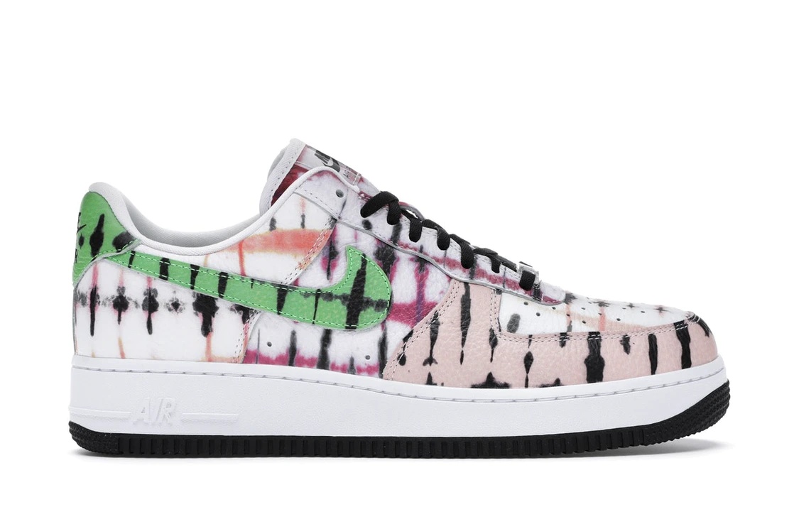 The Nike Air Force 1 Low Black Tie Dye W features several color schemes that define its overall appearance, with main hues being white, Green Strike, Washed Coral, and black. This Nike Air Force 1 with a Low Black Tie Dye design features leather at the upper part with vibrant shades of "Green Strike" and "Washed Coral" in women's sizing. The midfoot at the panels and tongue area introduce a hue reminiscent of magenta, accompanied by scattered "Black" blotches. While the forefoot displays a chaotic blend of colors, the heel areas offer a more organized appearance with a white base, while the rear and Swoosh overlays add a touch of "Green Strike" flair. According to our experts, the Nike Air Force 1 Low Black Tie Dye W stands out from the competition due to its versatile color scheme. It may be worn with a number of outfits due to its primarily white with black accents. This shoe made its market debut on September 4, 2020, with an estimated retail cost of $115. - Style CW1267-101 - Colorway White/Green Strike-Washed Coral-Black - Retail Price 115 - Release Date 2020-09-04 - Featured false