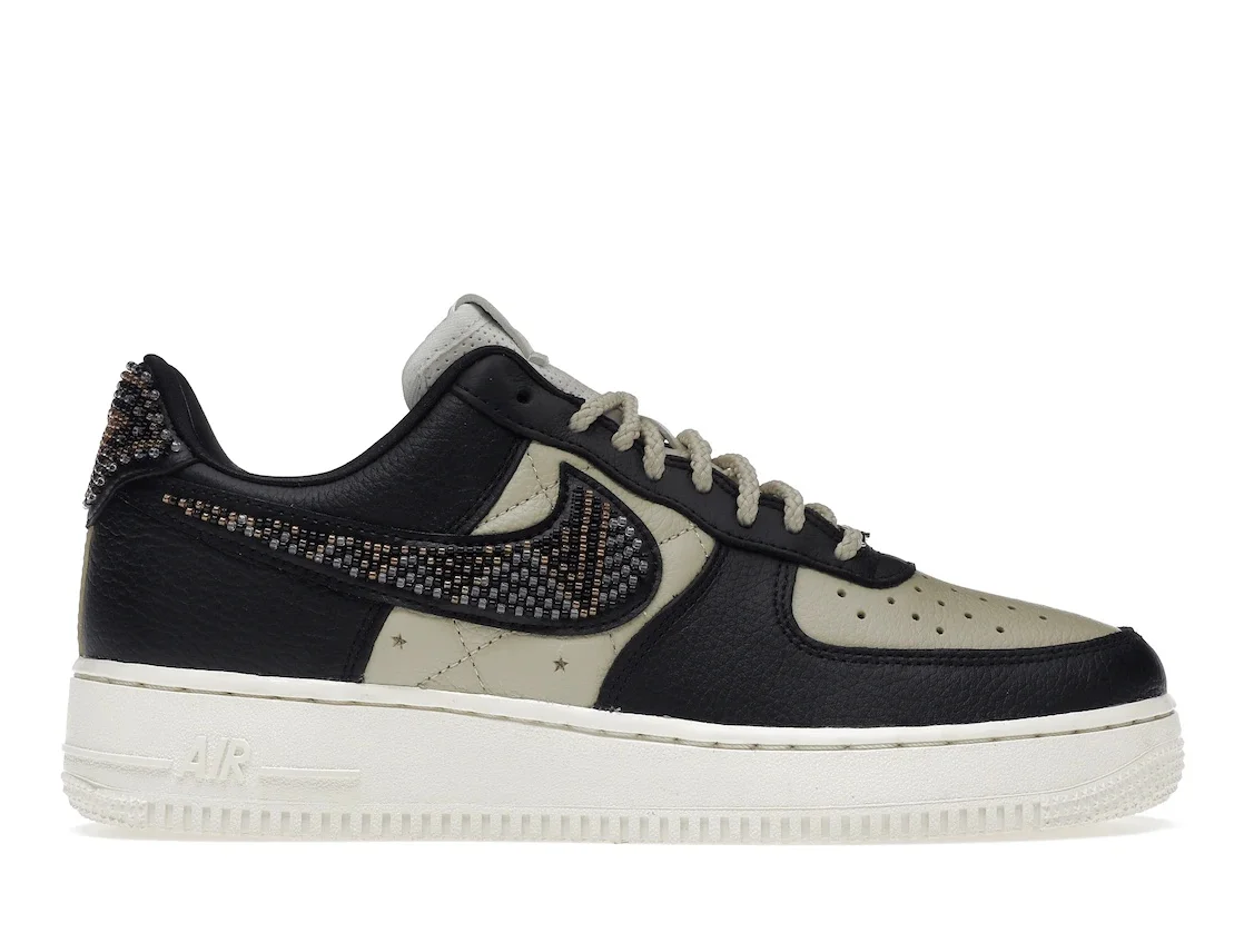 The Nike Air Force 1 Low Premium Goods The Sophia W features multiple colors that shape its appearance, with Sail, Sand, and black featuring as the dominant hues. The upper part of the Premium Goods The Sophia Nike Air Force 1 Low in women's sizing showcases a toe box and quilted quarter panel made of cream-colored tumbled leather. Additionally, the eyestay, forefoot, and heel overlay are constructed with black leather. The back tab and Swoosh feature embedded beading, which adds colorful accents, and the interior is lined with luxurious black satin. The tongue tag and sockliner display the branding of Premium Goods. Our shoe experts have noted that the Nike Air Force 1 Low Premium Goods The Sophia W has experienced a rise in demand. This is attributed to its extensive selection of colors, with a particular highlight on the appealing combination of black and sail upper that goes well with different outfits. The Nike Air Force 1 Low Premium Goods The Sophia W was initially released on January 31st, 2023, with a suggested retail price of $150. - Style DV2957-001 - Colorway Black/Multi-Color-Sand-Sail - Retail Price 150 - Release Date 2023-01-31 - Included Accessories White extra lace, Black extra lace, Special paper - Featured false