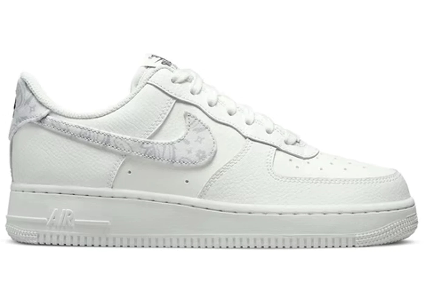 The Nike Air Force 1 Low White Paisley (Women’s) is a women’s sized version of the iconic Air Force 1 silhouette featuring a white color scheme with paisley print accents. The upper of this shoe is constructed using a combination of leather and synthetic material while the sole has a rubber construction. It is fully white bar the subtle Paisley accents on the Swoosh and heel tab. This Air Force 1 retains all the signature design elements like the perforated detailing in the toe, box, stitching detail around the midsole and the multidirectional pattern in the outsole. Our favorite feature on the Nike Air Force 1 Low White Paisley (Women’s) is the Nike Air-Sole cushioning unit in the midsole. It is strategically placed in the heel to provide responsive cushioning on the foot, and it also absorbs landing impacts on the foot during walking and other activities. The shoe was released at the retail price of $100 on 20th September 2022. - Style DJ9942-100 - Colorway White/Grey Fog-White - Retail Price 100 - Release Date 2022-09-20 - Featured false