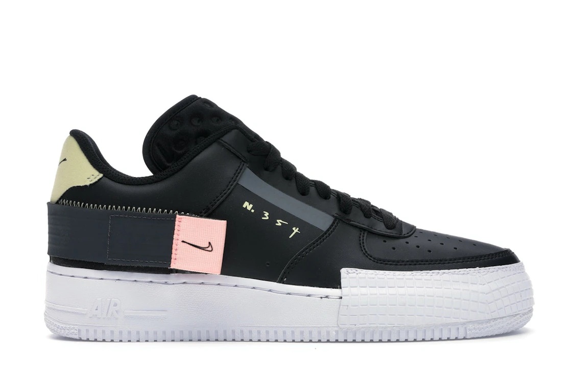 The Nike Air Force 1 Type Black features a black synthetic leather upper with the see-through materials showcasing the silhouette's closure system. From there, an additional strap featuring a tiny Nike "Swoosh" logo and an unusual tongue that includes crater-like indentations complete the design. The Nike Air Force 1 Type Black released in July of 2019 and retailed for $140. - Style CI0054-001 - Colorway Black/Anthracite-Zinnia-Pink Tint-White - Retail Price 140 - Release Date 2019-07-26 - Featured false - Product Line Nike Air Force