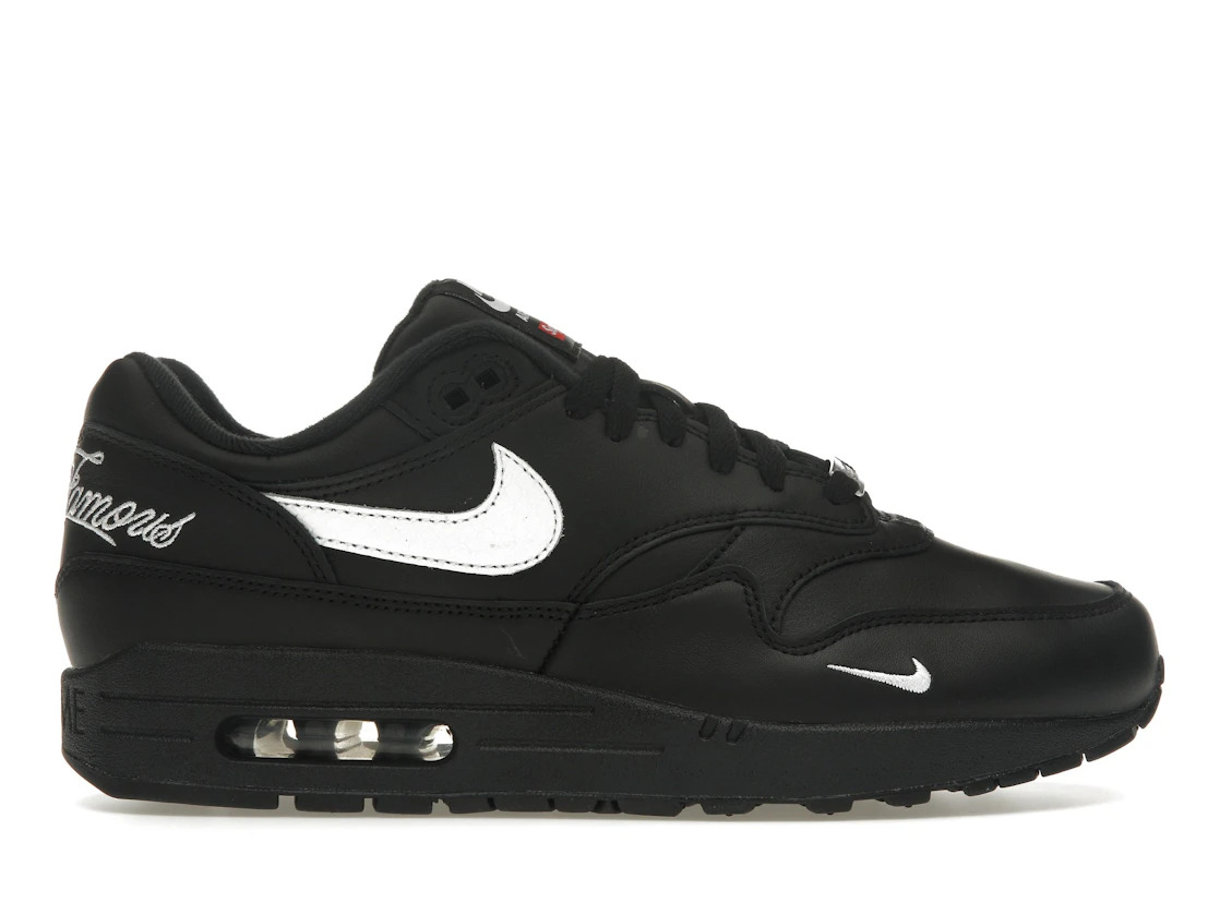 The Nike Air Max 1 '87 SP Supreme Black White is a leather sneaker with a monochrome Black upper, featuring an overlaid construction. The White Swoosh appears from underneath a Black overlay embroidered with World Famous branding in White script. The Swoosh in White accents the mudguard. The tongue displays Nike Air Max branding and the Supreme red box logo. A Supreme branded silver dubrae and visible Air unit in the Black midsole finish the aesthetic.Athletic wear brand Nike has become the world’s largest sneaker producer thanks to its iconic styles like the Air Max 1, which debuted in 1987. American skateboarding and lifestyle brand Supreme is known for their collaborations and art world inspiration. Therefore, it’s no surprise that Supreme worked with Nike on an exclusive Air Max 1 ‘87, which was designed by Tinker Hatfield and inspired by the visible construction of Paris’ Centre Pompidou.Our experts feel that the best feature of the Air Max 1 ‘87 is its nuanced branding, which balances its minimalism. The Nike Air Max 1 '87 SP Supreme Black White released on March 20, 2025, and retailed at $170. - Style HF8813-001 - Colorway Black/White/Black - Retail Price 170 - Release Date 2025-03-20 - Included Accessories Black Laces, Supreme Nike Hangtag - Featured false - Product Line Nike Air Max - Requester Matt M - Uploaded By MM