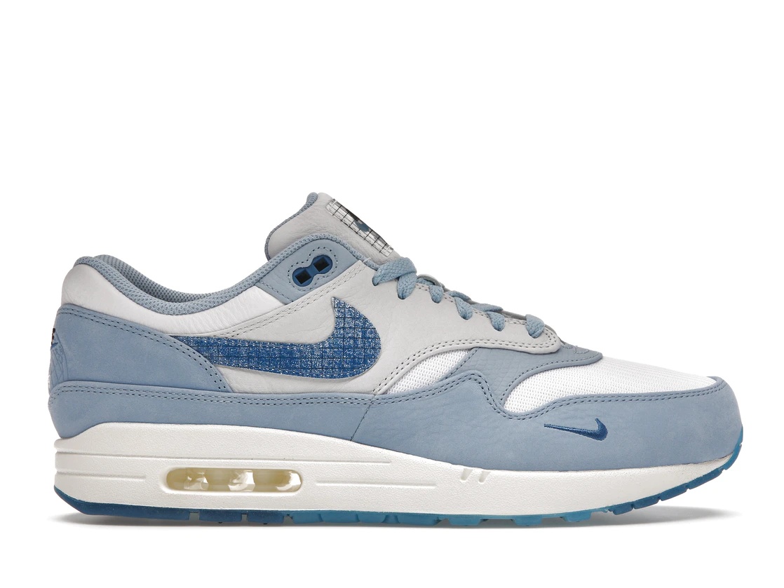To celebrate Air Max Day 2022, Nike delivered the Nike Air Max 1 Premium Blueprint. The North American-exclusive Nike Air Max 1 Blueprint highlights the silhouettes worldwide appeal and global impact. It features a white mesh upper with light blue Durabuck and tumbled leather overlays. Each Swoosh features a grid blue pattern, nodding to the composition of blueprints. At the heel, a globe embroidery and classic Nike Air logo completes the design. The Nike Air Max 1 Blueprint released in March of 2022 and retailed for $160. - Style DR0448-100 - Colorway White/Dark Marina Blue/Leche Blue - Retail Price 160 - Release Date 2022-03-26 - Included Accessories White extra laces - Featured false