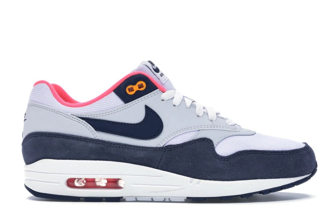 The Nike Air Max 1 Pure Platinum Midnight Navy Racer Pink W is a unique colorway of the Air Max 1 silhouette and was released as part of the Nike Air Max 1 line in women's sizes. The upper of the Pure Platinum Midnight Navy Racer Pink Nike Air Max 1 W is crafted with a combination of premium materials, including leather and mesh. The sneaker incorporates Air cushioning technology located in the sole. The Air unit provides responsive and comfortable cushioning for every step. The shoe also features Nike branding on both the heel and tongue. We believe that the outstanding quality of the Nike Air Max 1 Pure Platinum Midnight Navy Racer Pink W is its striking color combination. The use of Pure Platinum, Midnight Navy, and Racer Pink creates a lively and bold look. The Nike Air Max 1 Pure Platinum Midnight Navy Racer Pink W was released on February 22nd, 2019 at a retail price of $110. - Style 319986-116 - Colorway White/Midnight Navy-Pure Platinum-Racer Pink-Laser Orange - Retail Price 110 - Release Date 2019-02-22 - Featured false