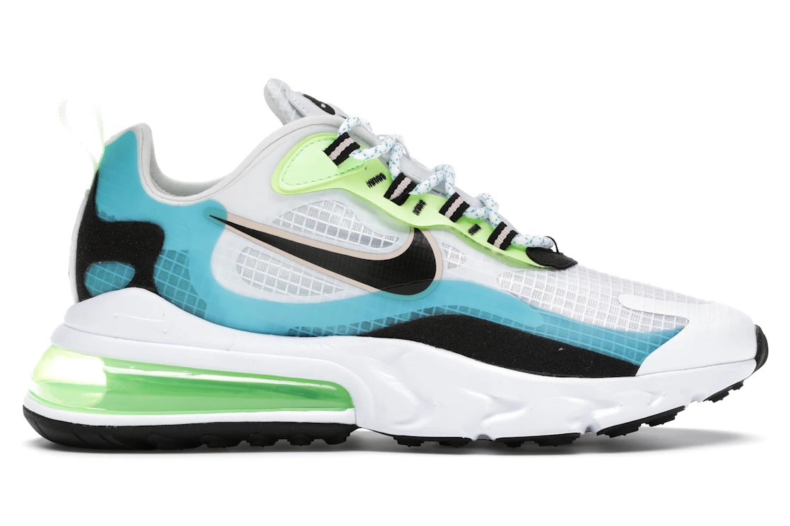 The Nike Air Max 270 React Oracle Aqua Ghost Green is an eye-catching sneaker that dresses an iconic silhouette in vibrant colors and various textures. The style of this shoe is matched only by its high-octane performance capabilities. This iteration of the Nike Air Max 270 React sports a colorway of Oracle Aqua, Ghost Green, Washed Coral, and black. The semi-translucent synthetic upper has a white-on white-cross hatch pattern accented with undulating blue and black synthetic overlays. The laces snake through black and white looped eyelets that match the synthetic Nike Swoosh on the side panel. A vertical Nike Swoosh adorns the heel tab and Nike branding appears on the white tongue tag. The aspect of this sneaker that impresses our shoe experts the most is the react midsole encapsulating an Air Max unit under the heel. All this cushioning, support, and energy return rests atop a black rubber outsole designed with vents that allow the React to expand. The Nike Air Max 270 React Oracle Aqua Ghost Green was released on April 8, 2020, for retail price of $170. - Style CT1265-300 - Colorway Oracle Aqua/Ghost Green-Washed Coral-Black - Retail Price 170 - Release Date 2020-04-08 - Featured false - Product Line Nike Air Max