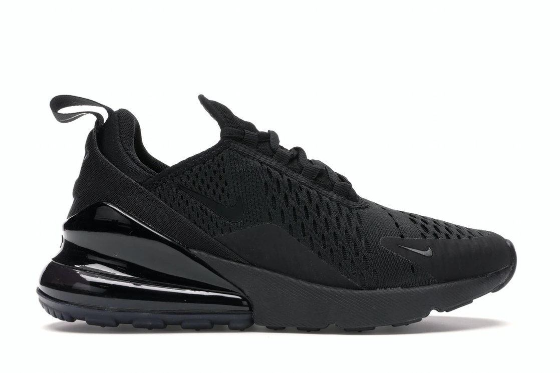 The Nike Air Max 270 Triple Black (W) is another sleek addition to the Air Max collection. It is a sneaker made with a rubber sole and aerated top that makes sure your feet are able to breathe. The Nike Air Max 270 release for women is displayed in black color. It features a web-like top material rubber outsole and lace-up closure. The shoe has a netted and fabricated top, a fluff midsole, and an elastic inner sole. The Nike Air Max 270 Triple Black (W) sneaker sold at a retail price of $150 and was out in the market on August 2, 2018. - Style AH6789-006 - Colorway Black/Black-Black - Retail Price 150 - Release Date 2018-08-02 - Featured false