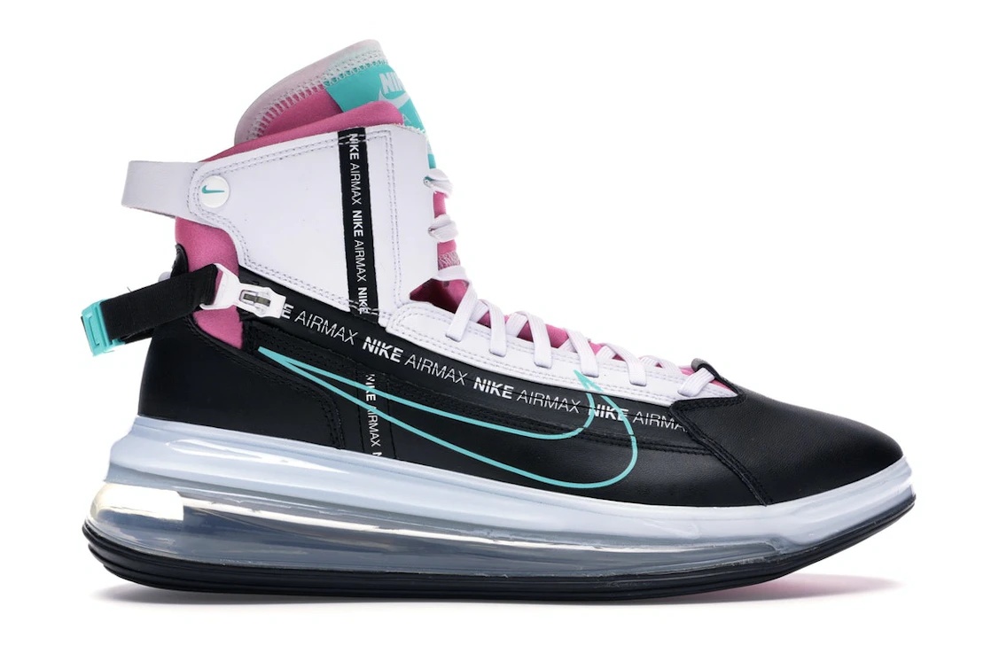 The Nike Air Max 720 Satrn South Beach showcases a fusion of basketball-inspired design with an iconic color palette that includes vibrant shades of bright pink, teal, white, and black, defining its technical, layered upper. Crafted from a blend of neoprene and leather, the South Beach Nike Air Max 720 Satrn incorporates zippers and a heel clip for a dynamic look. The bright teal accents on the tongue, heel, and outlined Swoosh across the midfoot draw attention, while the Nike Air text running down the collar intersects at the signature Saturn zipper. This high-top hybrid features 720 degrees of Max Air cushioning, delivering exceptional comfort for extended wear. Constructed with leather overlays and a neoprene collar that provide a sock-like fit, the shoe also features Air Max-branded strips and highlighted Swooshes across the upper. The defining attribute of the Nike Air Max 720 Satrn South Beach lies in its 720 degrees of Max Air cushioning, ensuring a supremely comfortable experience while seamlessly integrating performance aspects with its design. The sneaker debuted for $200 on May 1, 2019. - Style AO2110-002 - Colorway Black/White-Bright Crimson-Hyper Jade - Retail Price 200 - Release Date 2019-05-01 - Featured false - Product Line Nike Air Max