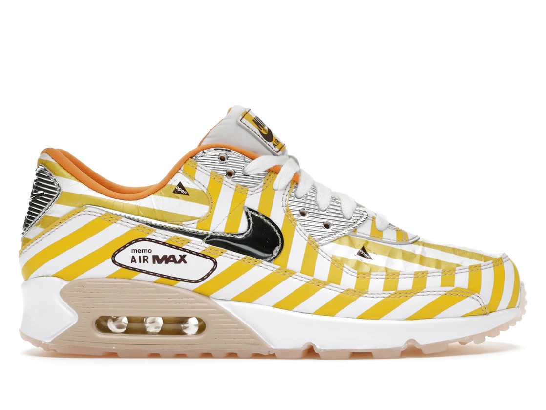 Inspired by Japanese convenience stores' distinctive fried-chicken packaging, Nike made the Nike Air Max 90 Fried Chicken available as part of its distance running collection. The Nike Air Max 90 Fried Chicken has upper white-and-yellow stripes with a tearaway outer layer on the collar and toe box. It displays orange suede contrasting with various branding schemes such as AM90 and Hot Air in a cartoon font. Also, it includes a graphic sock liner featuring a pair of metal tongs with cropped Swoosh stitched-on heel patch and chrome detailing appearing on the shoe's molded eyelets. The Nike Air Max 90 Fried Chicken was released on March 19, 2021, retailing at $140. - Style DD5481-735 - Colorway Speed Yellow/Shimmer-White-Siren Red-Black-Pure Platinum - Retail Price 140 - Release Date 2021-03-19 - Featured false - Product Line Nike Air Max