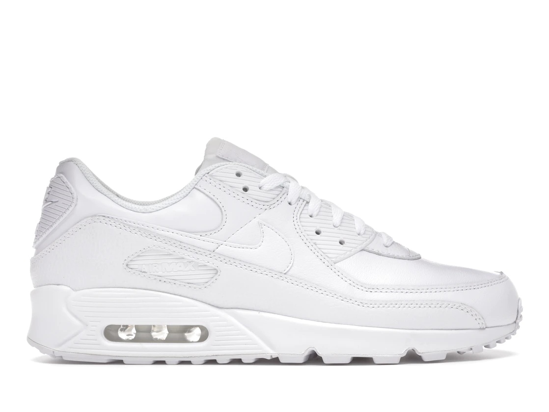 The Nike Air Max 90 Leather Triple White 2020 takes on a 1990 original design, and is covered in an all-white finish. The sneaker is constructed of white TPU eyelets, a mesh upper with stitched leather overlays, a waffle-tread rubber outsole for traction and an Air-infused midsole for cushioning. Further, it displays an Air Max logo on both medial sides with a padded tongue panel printed with a Nike Swoosh emblem. Additionally, this Air Max Triple version has printed Nike branding on its heel. The Nike Air Max 90 Leather Triple White 2020 debuted on July 28th, 2020, and retailed at $130. - Style CZ5594-100 - Colorway White/White-White - Retail Price 130 - Release Date 2020-07-28 - Featured false