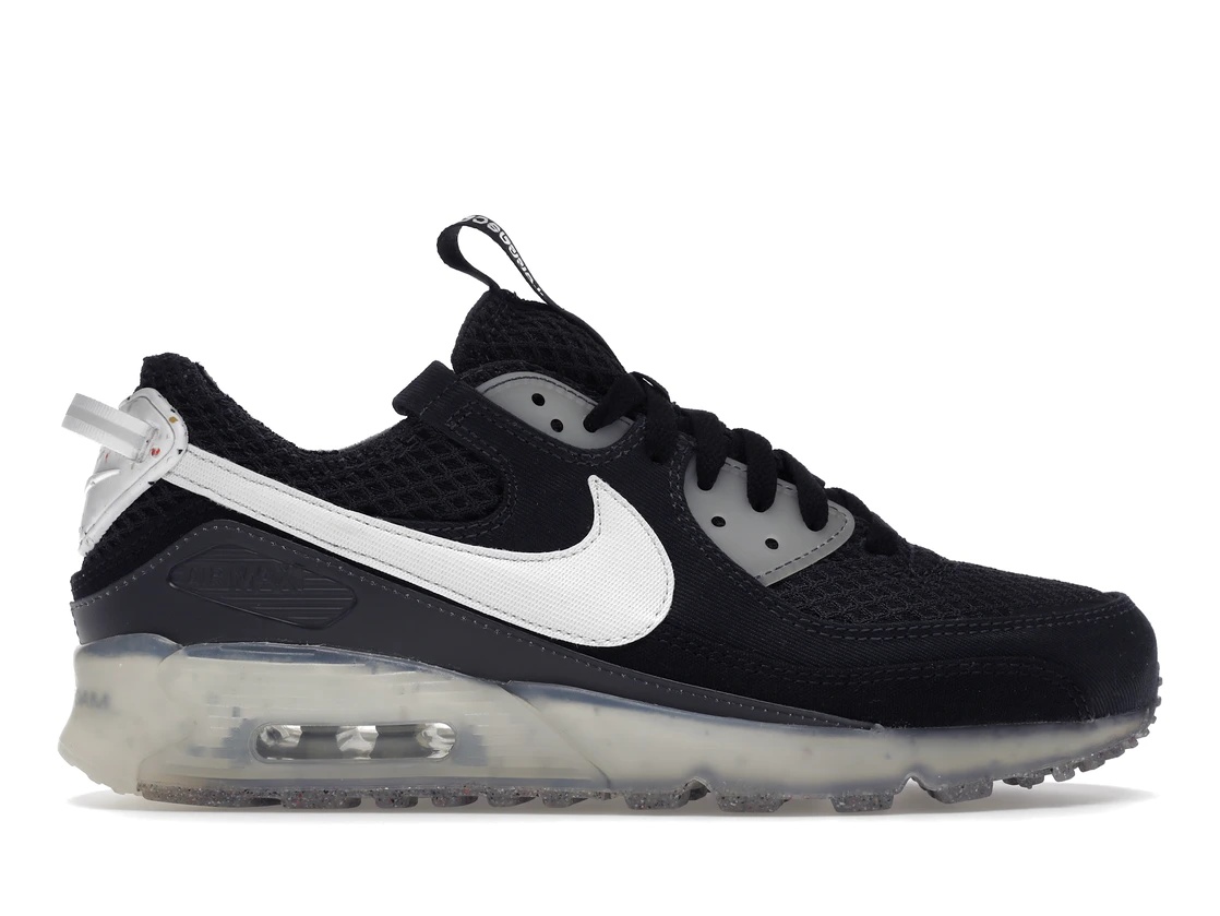 The Nike Air Max 90 Terrascape Crater Foam Black White incorporates recycled materials into the construction of the shoe. The Black and White sneaker features a mesh upper with synthetic overlays in black. The Swoosh, speckled heel, and hits on the eyestays are all in white. Both the tongue and heel sport pull tabs. Terrascape branding adorns the tongue tab and insole. The Crater Foam midsole is wrapped in translucent rubber and features a visible Max Air unit in the heel. The Nike Grind rubber outsole completes the eco-friendly theme. The Nike Air Max 90 Terrascape Crater Foam Black White debuted June 7th, 2022 for $150 retail. - Style DM0033-002 - Colorway Black/White - Retail Price 150 - Release Date 2022-06-07 - Featured false