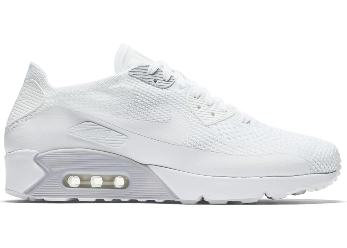 In this iteration of the AM90, the Nike Air Max 90 Ultra 2.0 Flyknit White changes the OG colorway to adopt a crisp white hue with hits of platinum. Nike’s Flyknit technology is used to make the Nike Air Max 90 Ultra 2.0 uppers. The vamp incorporates a breather surface in a white color. Similarly, the tongue has a textile cover graced by embossed branding. Ribbed TPU overlays, popular with the AM90, feature on the eyestays. They have two-line eyelets, allowing a personalized fit. Reinforcing overlays cover the quarter panels and form a white tone-on-tone Swoosh. Additional "AIR MAX" branding embellishes the side walls on visible islands below the collar. Our experts love these shoes’ TPU reinforcements in white and platinum shades. They adorn eyestays, quarters, and a branded heel counter. A platinum ribbed midsole also outlines the Air Max unit on the heel. Nike released the Nike Air Max 90 Ultra 2.0 Flyknit White on April 20th, 2017, for $160. - Style 875943-101 - Colorway White/White - Retail Price 160 - Release Date 2017-04-20 - Featured false - Product Line Nike Air Max